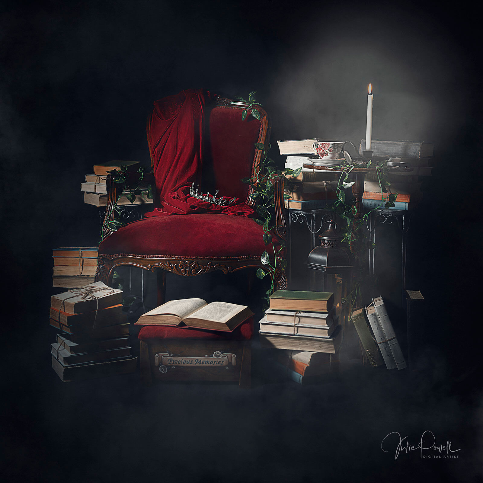 Books can be used to add a pop of color or to enhance a tonal range. Books can be used to brighten or darken a scene. They can be used to add a line to guide the viewer’s eye. I have a few books; you have probably noticed the same ones again and again. But using the same books and placing them in different ways you can use them over and over again. In the below piece I did a composite using the same books repeatedly to make a whole room full of books.