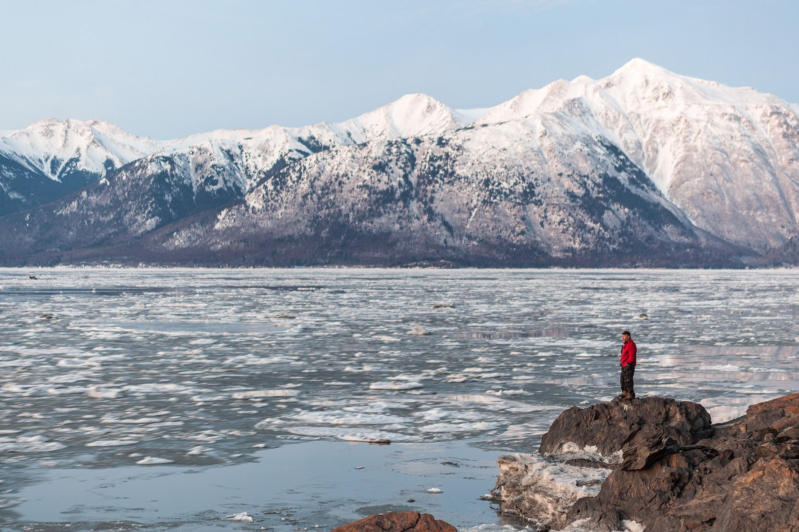 The opening photo is daylight color balanced. The snow and ice floes in Turnagain Arm outside of Anchorage are blue because they are lit by the super blue sky. The photo below has the blue color cast removed. Technically, it is a more accurate version. Aesthetically? That’s a creative decision.