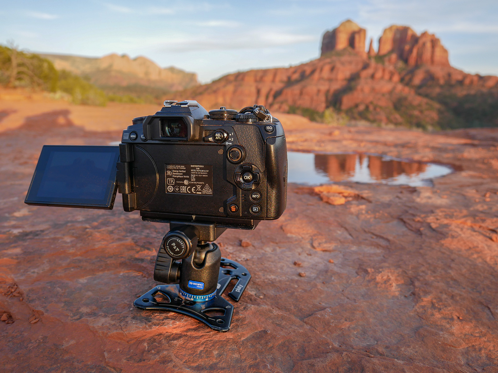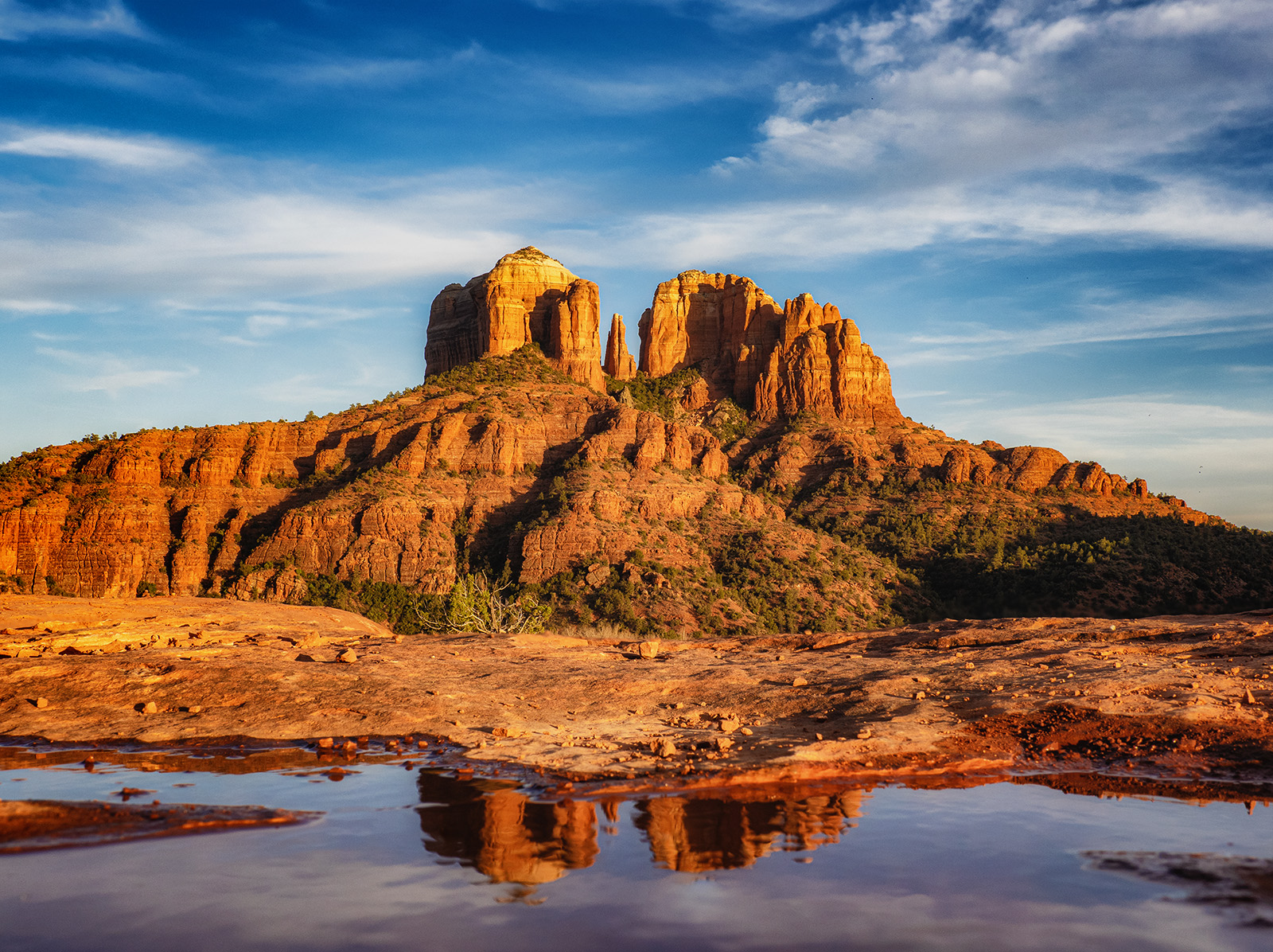 I know an area in Sedona, AZ, that is occasionally photographed with water reflections. Unfortunately, I live in a drought area where substantial rains are few and far between. I remembered the thought of building your own reflection pool from the conference. Knowing that a small bottle of water wouldn’t make a dent in the porous red rock surface. I hiked in about a mile with 50 pounds (6.5 gallons) of water, and searched out an area that would make a small pool without running away and was able to create images with a foreground reflection of Cathedral Rock. Magic!