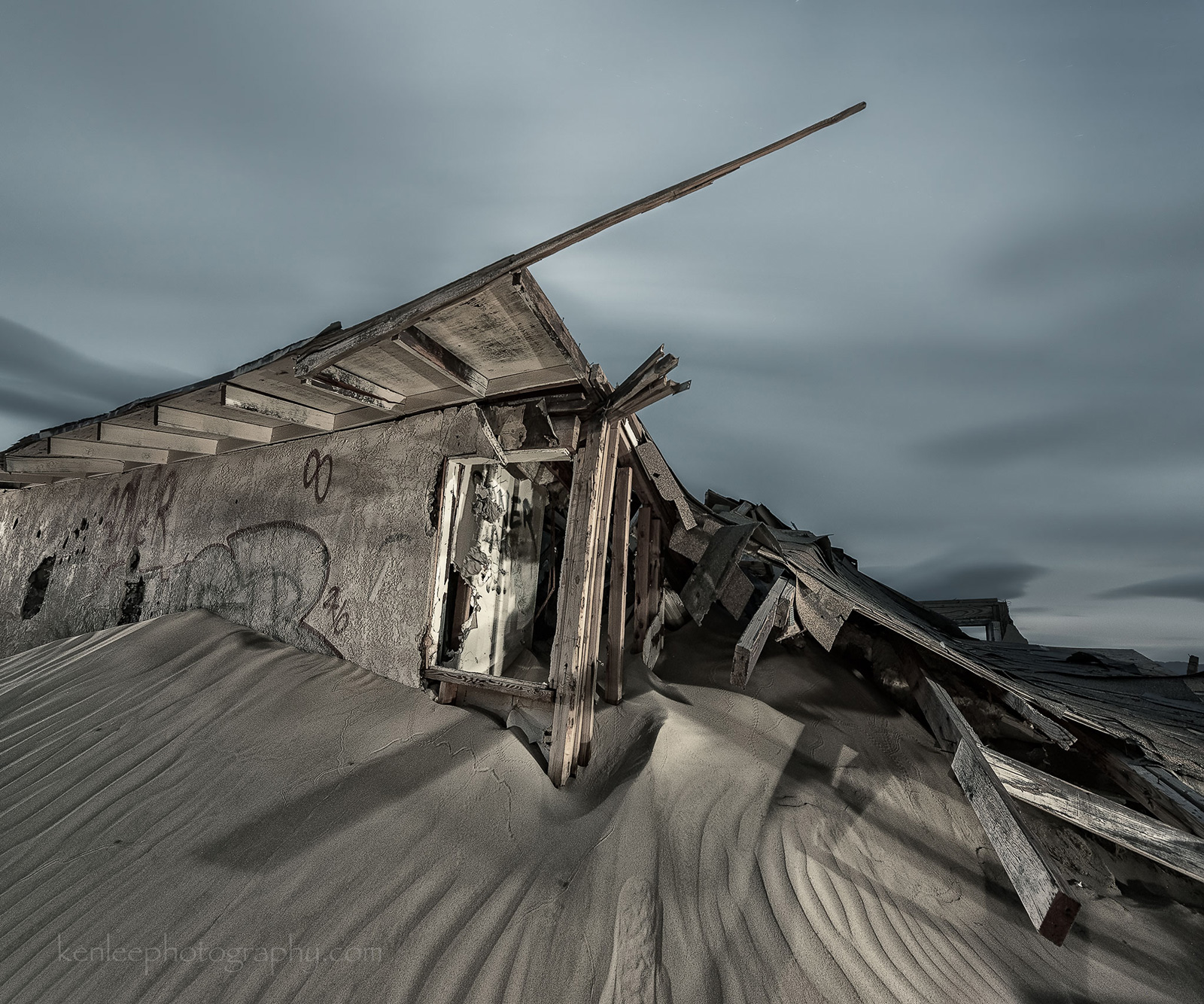 Initially disappointed, I began to realize that the clouds might add a certain eeriness to some of the photos of houses buried in the sand. Here’s a photo in which I actually desaturated the photo slightly to go with the cloudy feel and exaggerate the already eerie feel.