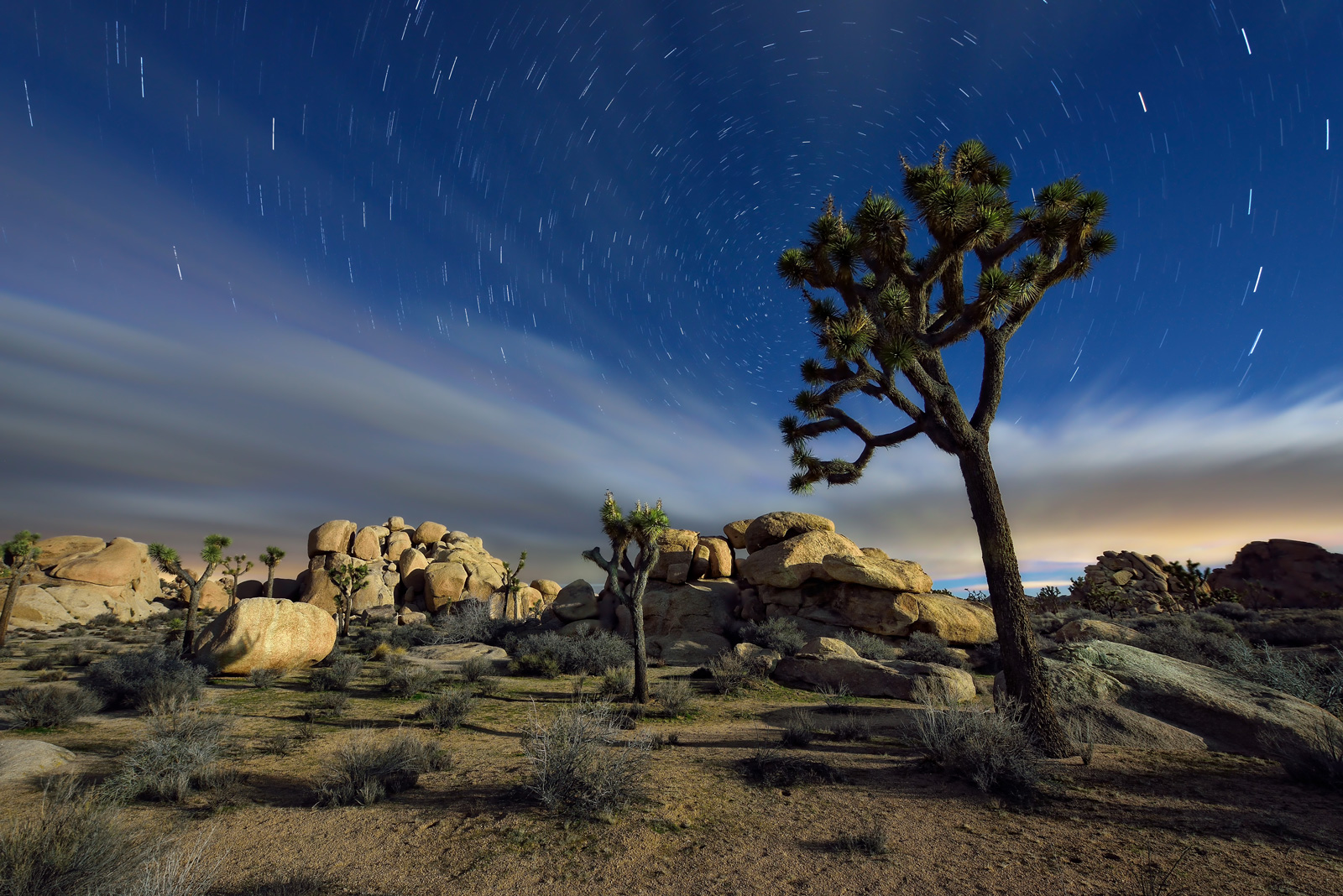 The above photo, also taken in Joshua Tree National Park, shows quickly moving low clouds, and again, the long exposure adds a sense of drama and movement. Here, an almost full moon backlights the Joshua Tree and adds a beautiful glow to the clouds.