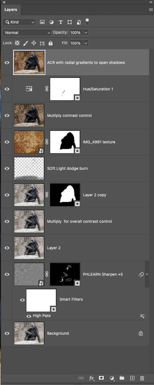 To increase contrast consistently across the entire image I recommend making a copy of the layer and changing the Blend Mode to Multiply. This has the effect of darkening the photo by one full stop. If that is too much you can lower the opacity of the layer to taste. 33% opacity is 1/3rd of a stop change. 66% 2/3rds of a stop. But the beauty of Photoshop is you don’t need to know numbers. Just play with opacity and what you see is what you get.