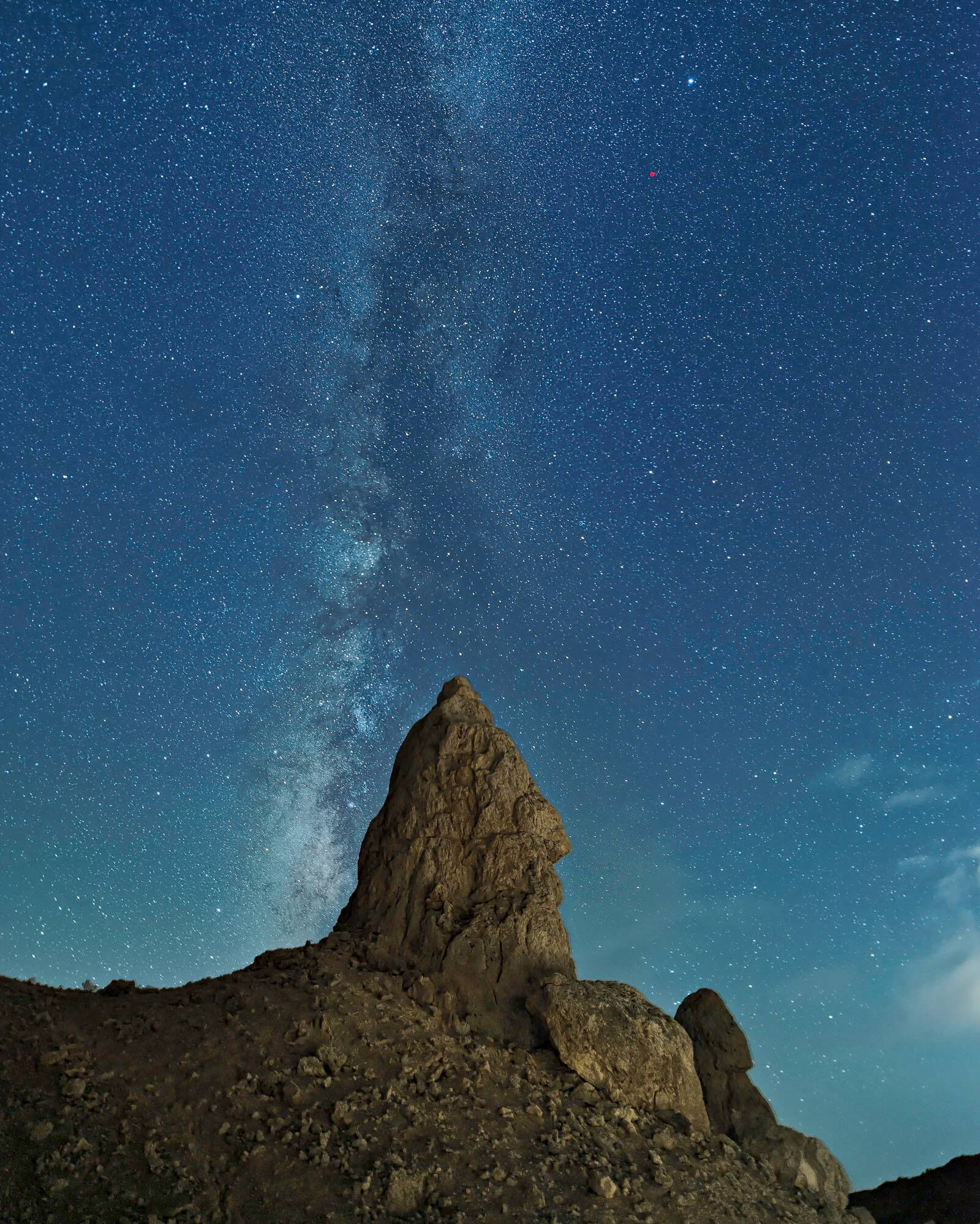 Other night skies can look blue too. Sometimes, when the Milky Way is out, the sky might still appear blue even though there’s no sunlight. A true representation of the sky during this time is closer to black or really dark gray. However, some photographers might take some artistic liberties and set the White Balance of the camera to a cooler setting, such as 3200 or 3300K. This creates a blue sky, and can be done for artistic purposes. Many night photographers feel they are creating art, and find a slightly blue night sky can look quite pleasing. Other times, the photographer might choose to go with a black sky because it is more accurate and might fit the mood of the photo better.