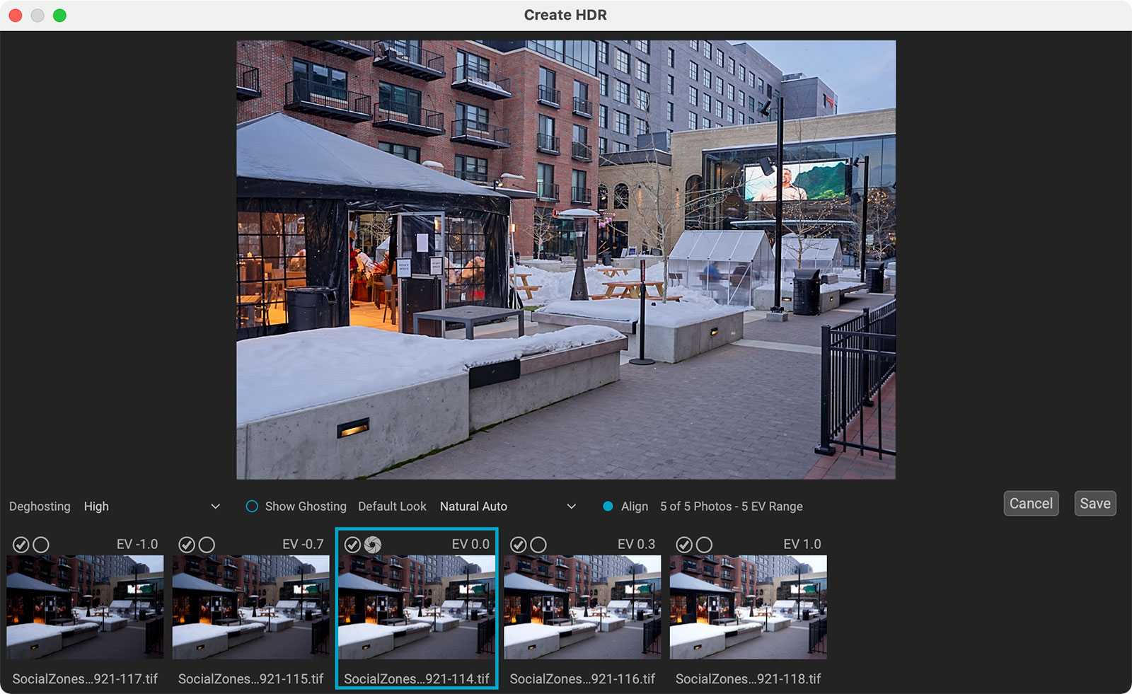 Once I send the brackets to ON1 HDR, it merges them and provides me with some initial options. I typically don’t want ghosting in my images, so I turned this to the High value. Outside of that, I don’t adjust any of the default options.