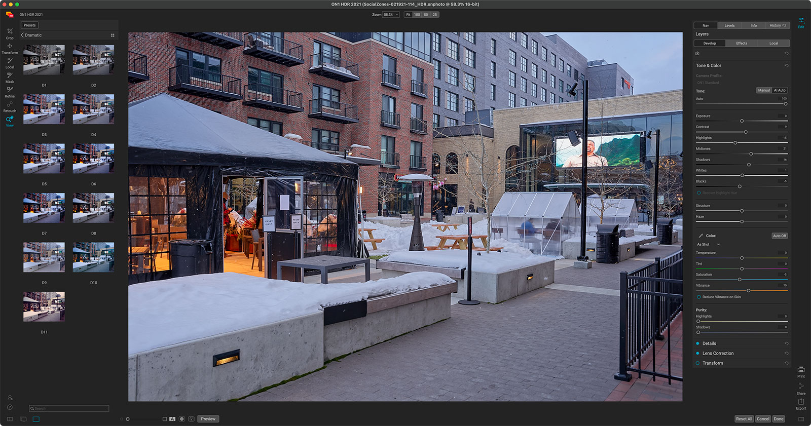 ON1 HDR lets you adjust all the basic development tools you’d find in other photo editors, with everything from exposure to color. It also lets you make lens corrections and level your image — super handy for architectural wide-angle shots.