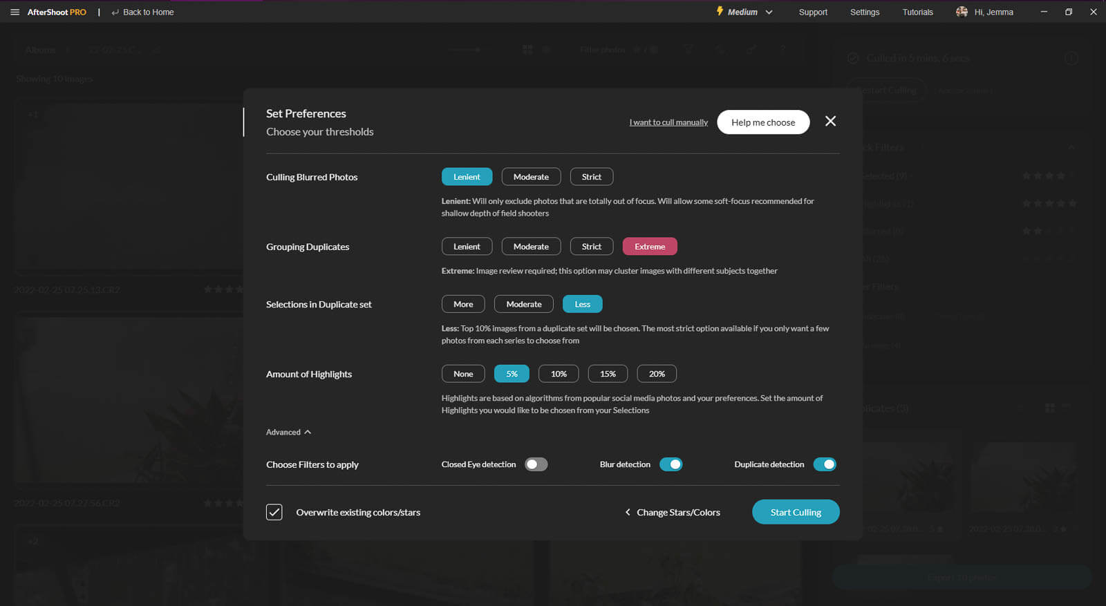 To cull in AfterShoot, click the New Album button, chose your folder, and set your preferences for the cull. The options in Set Preferences are pretty self-explanatory. Expand the Advanced drop-down to chose whether closed eyes, blur and duplicates are detected. Change Stars/Colors is important for customizing your workflow.
