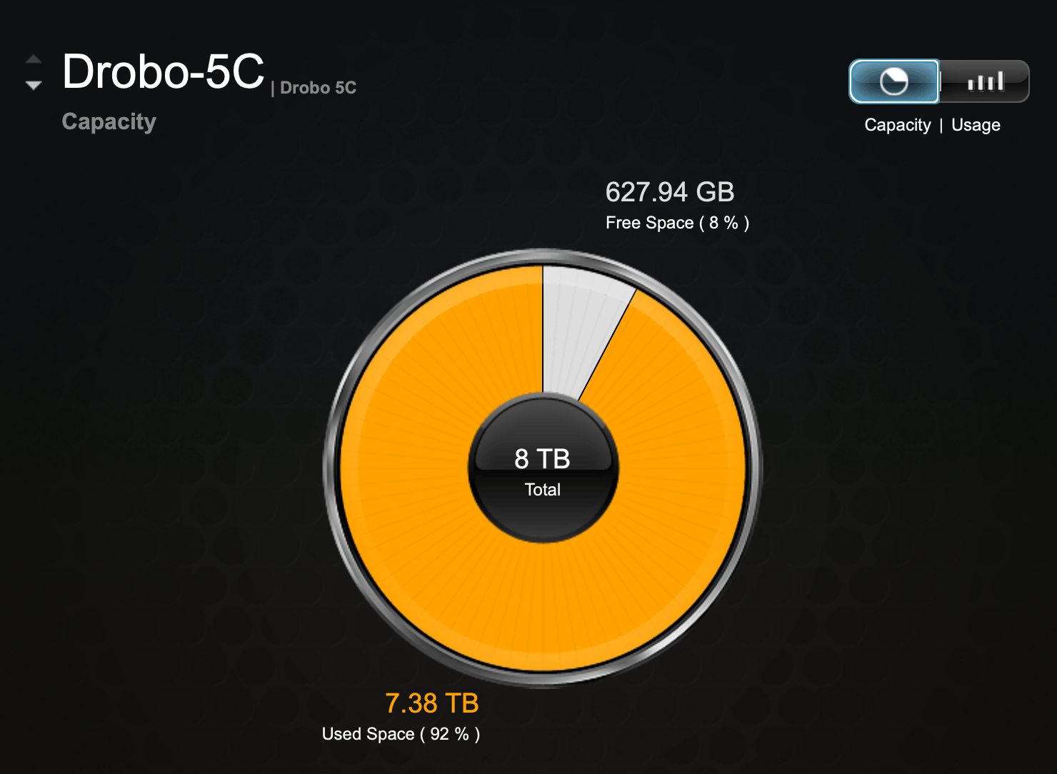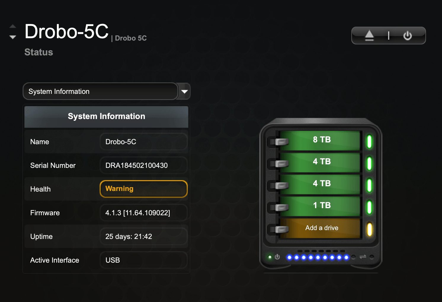 I’m currently using the Drobo 5c direct-attached storage (DAS) unit as my backup solution. Here’s a screenshot of the four hard drives that I installed and that totaled 17TB of available space.