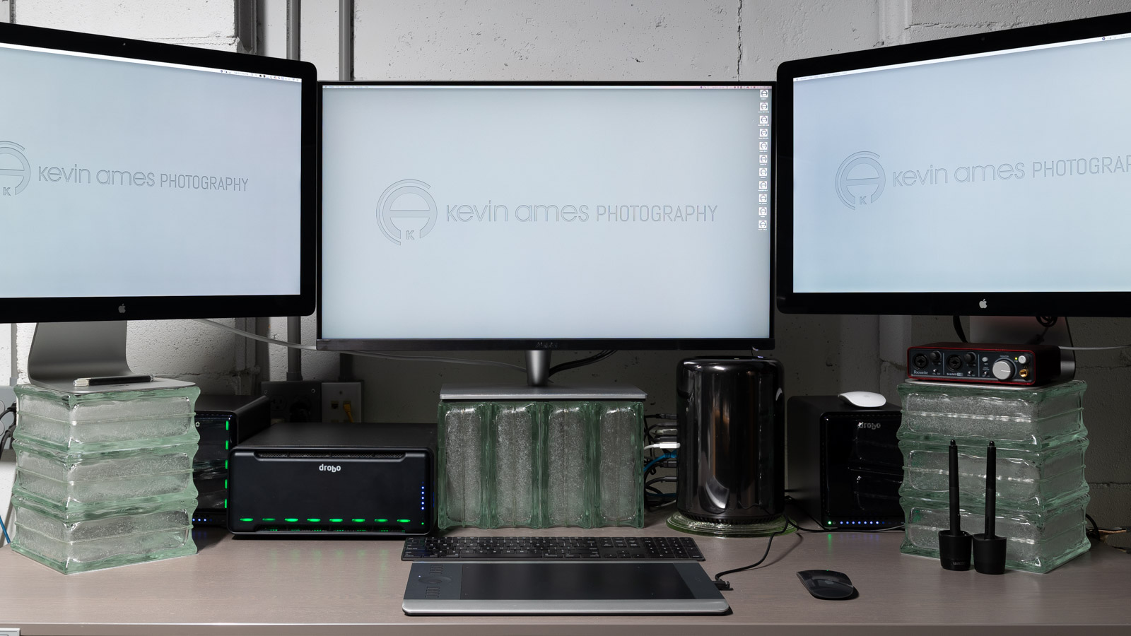 The Drobo 8D is my working drive. It’s speed and large capacity mean that I’ll have space for the biggest projects. That space is monitored and protected by the 8D. A Drobo 5D3 with 5 bays backs up the automatically 8D every night with Carbon Copy Cloner.