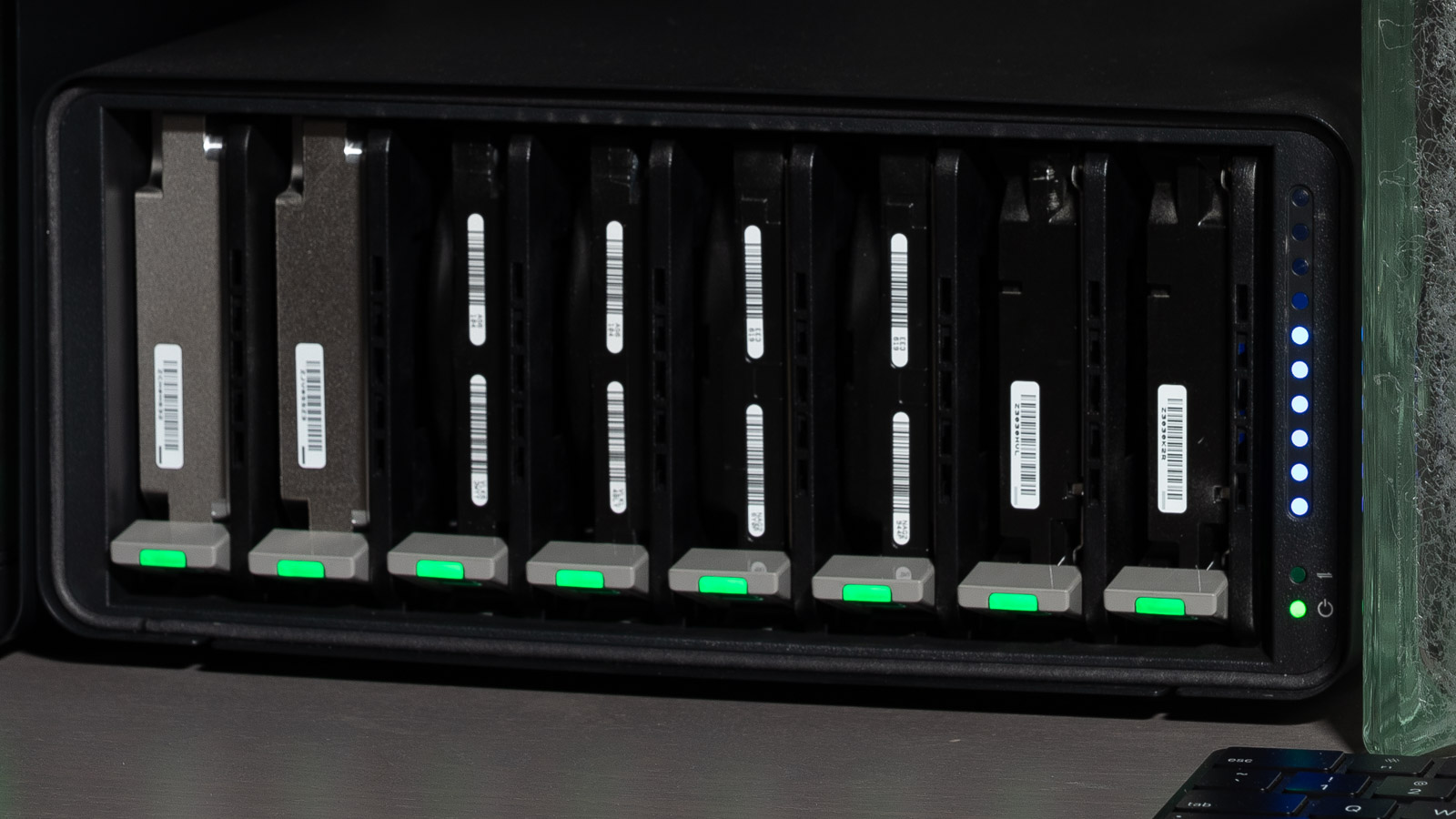 The 8D has a slot in the back for a 2.5″ SSD drive that acts as a live cache that speeds data transfers from the drive array. Additionally, the 8D cascades data to its drives speeding write and reads.