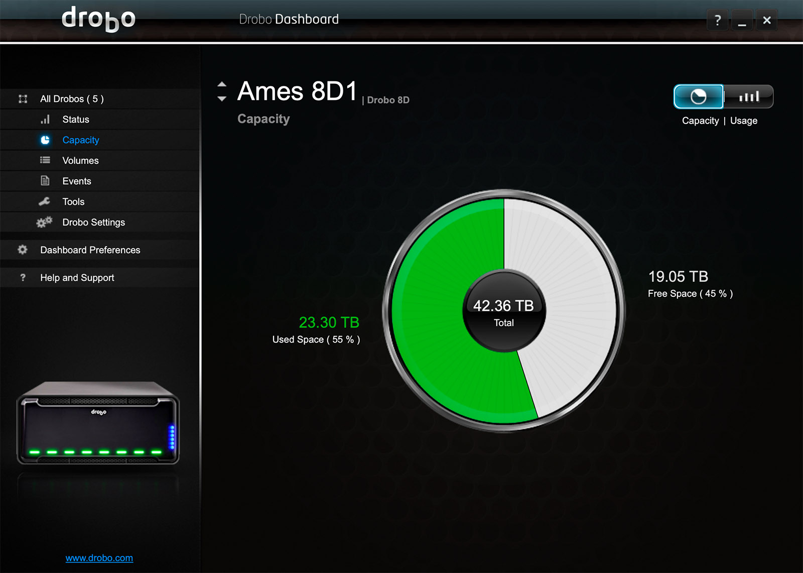 The onboard computer in the 8D allows up to 16 volumes to a total of 128TB of storage. A volume is like a hard drive on the desktop. The difference is that the Drobo manages this depending on the number and size of the drives in the bays. Best of all, any Drobo will work with just two hard drives. Additional drive capacity happens as more drives are added or when smaller ones are retired and replaced with larger ones.
