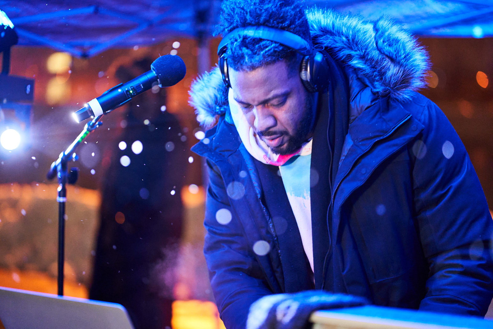 The blue spotlight and snow hit the scene just right, and I got super lucky with the shot. But I didn’t get lucky with the movement. He had moved just enough to make for a soft face. Could I rescue the image?