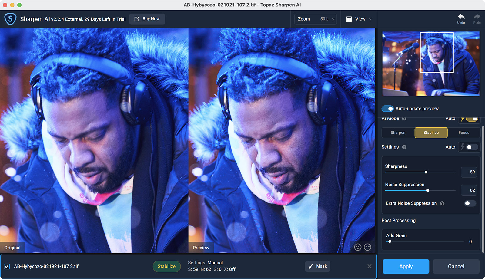 I utilized the Stabilize AI mode, and then went with the Auto setting. It did pretty well, adding some sharpness to AB’s face. I was able to see the before and after right on my screen, and was impressed. I bumped up the sharpness a few bumps more, and called it good.