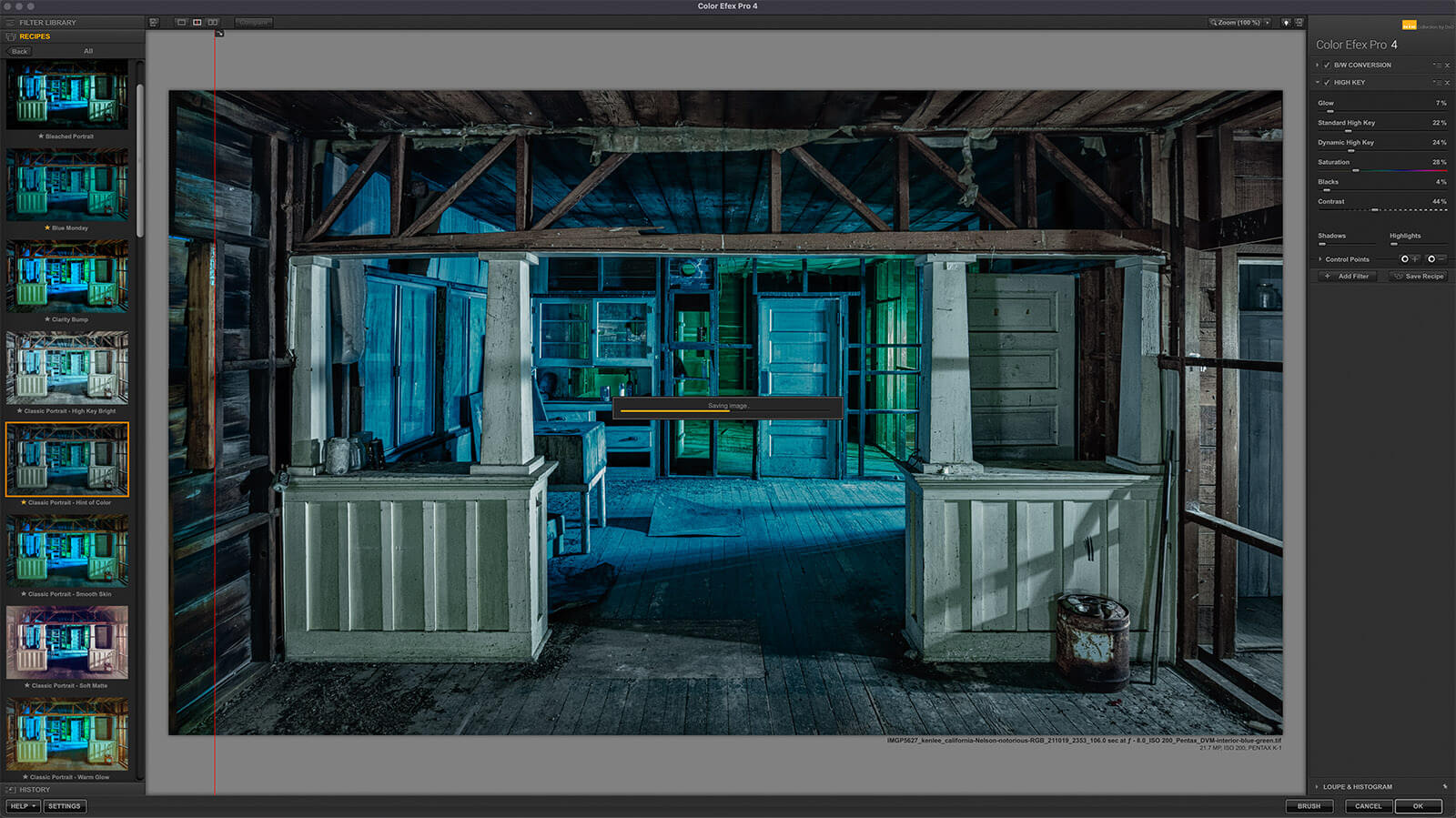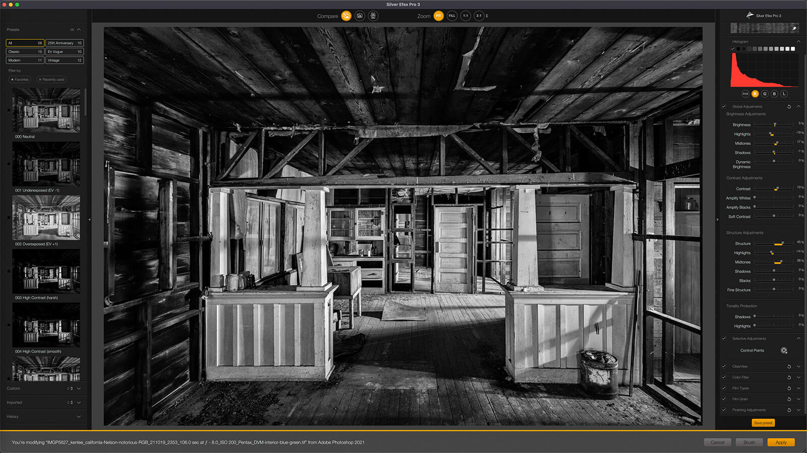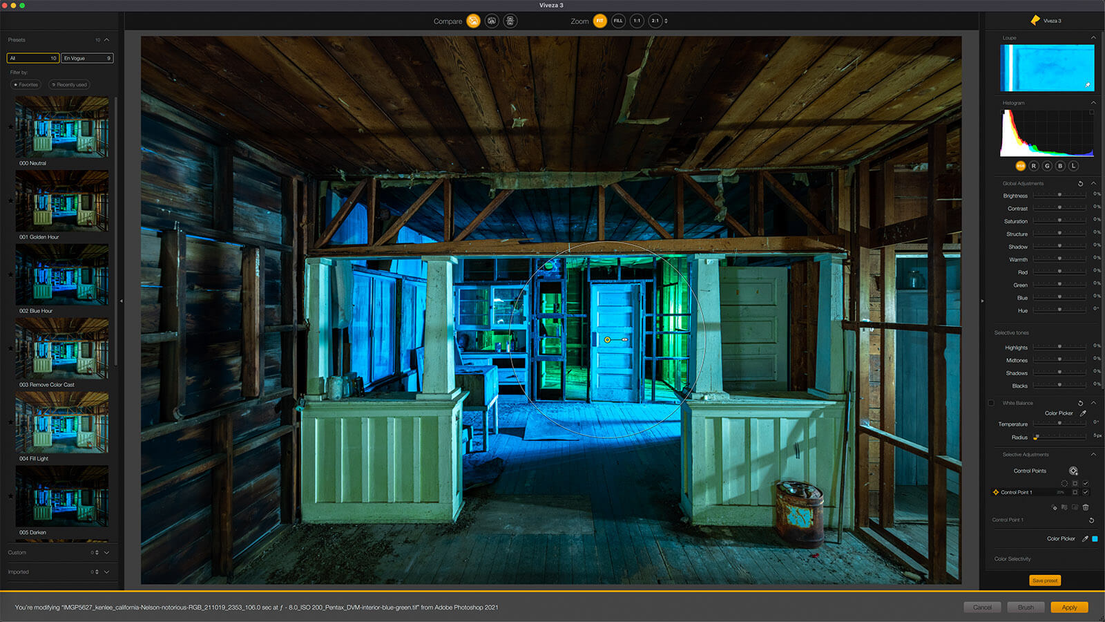 I’ll briefly offer an overview of the collection. Then we will have a glimpse into several of the plugins. To showcase this, I’ll edit a light painted night photo of the abandoned interior of a 100-year old farmhouse only using the Nik Collection suite.