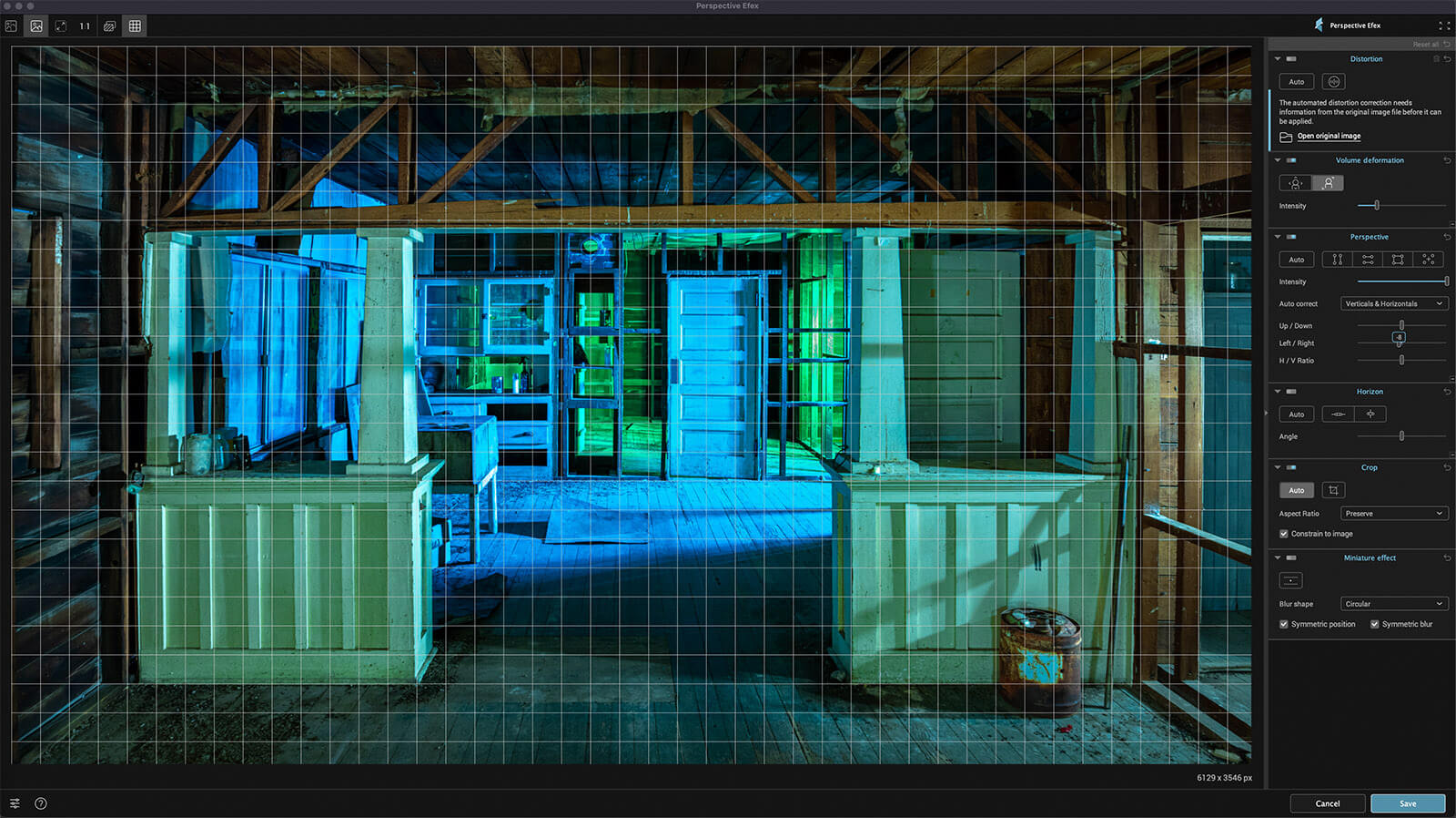 The plugin addresses geometric distortion in your images via automatic corrections or manually placed reference lines. The Auto version works extremely well, correcting numerous distortion simultaneously. Perspective Efex also corrects keystoning in architecture images. Also, it corrects lens distortions such as barrel, pincushion and fisheye distortion via the Volume Deformation panel.