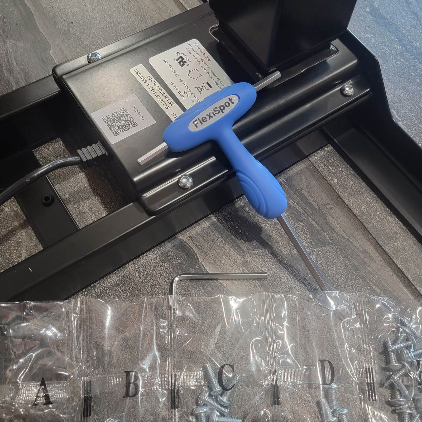 Another nice thing about the openness of the desk is that you can keep a small piece of exercise equipment under there, such as a step, walking pad, or other calorie-burning aid. Also note that FlexiSpot offers accessory options. For example, you can install a power hub on the desk or install a small pullout drawer for smaller office supplies.