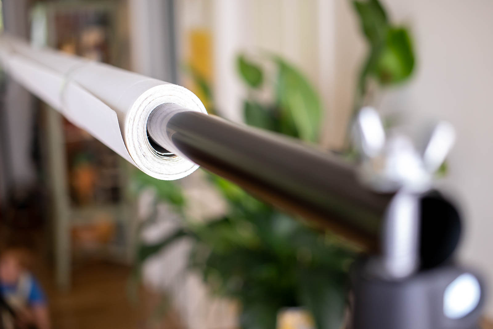 Setting up a portable studio at home with a backdrop is straightforward. Set up your backdrop stand and thread the rolled backdrop onto the bar.