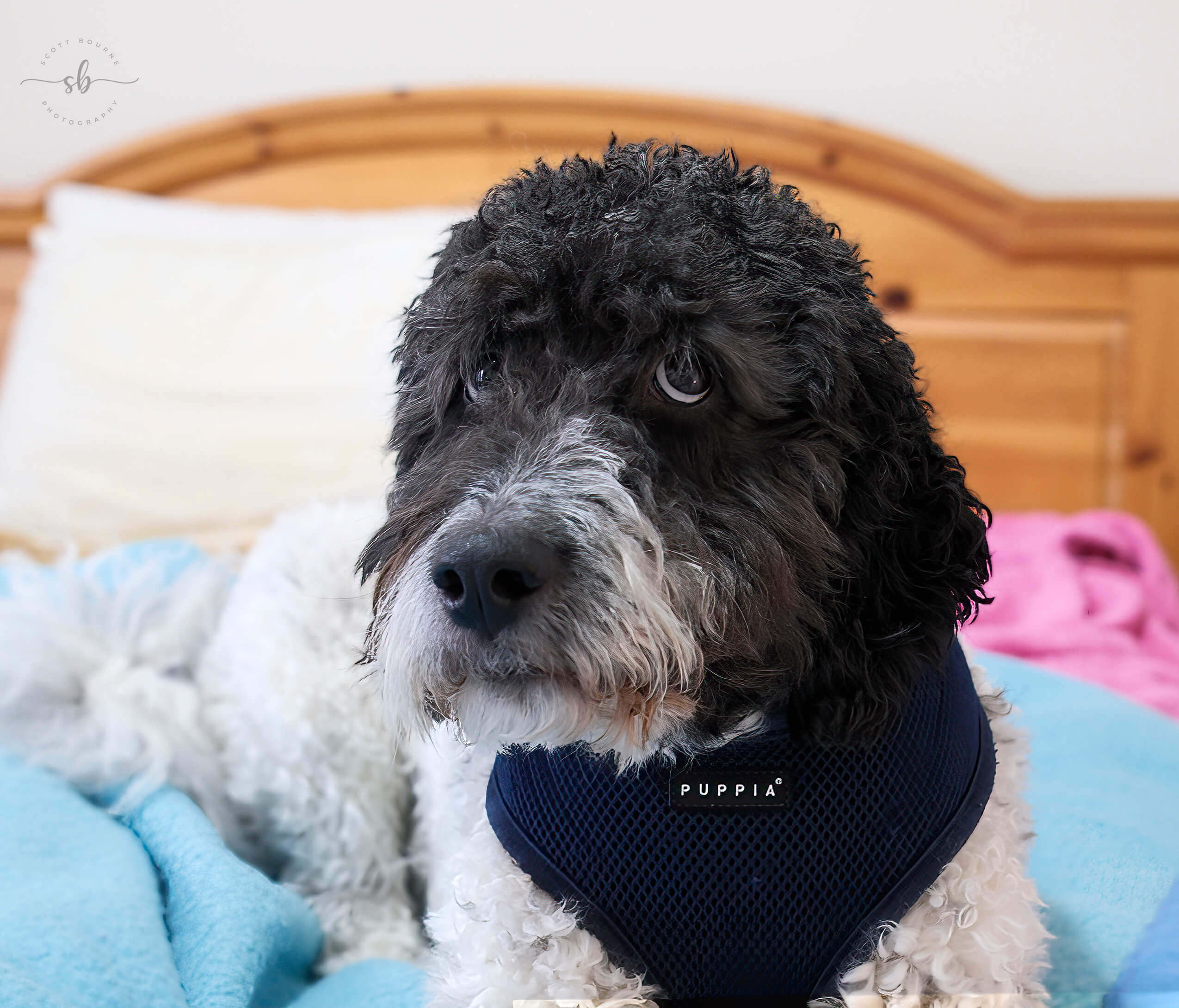 Scott, here’s Ruckus, beneath his portrait. Similar bed, different dog! What’s your dog’s name?