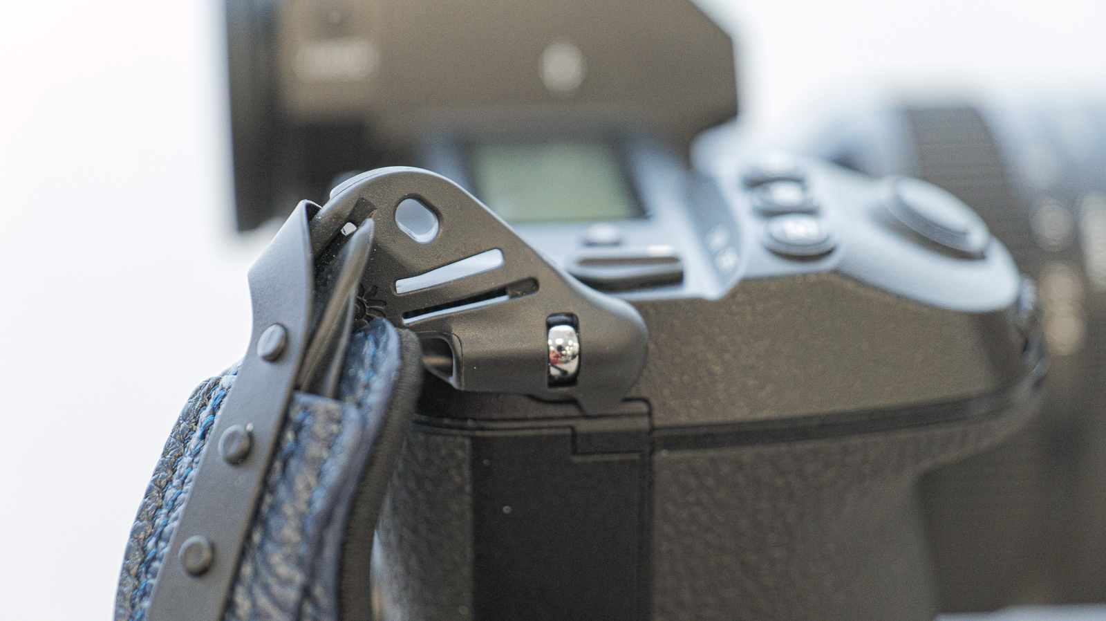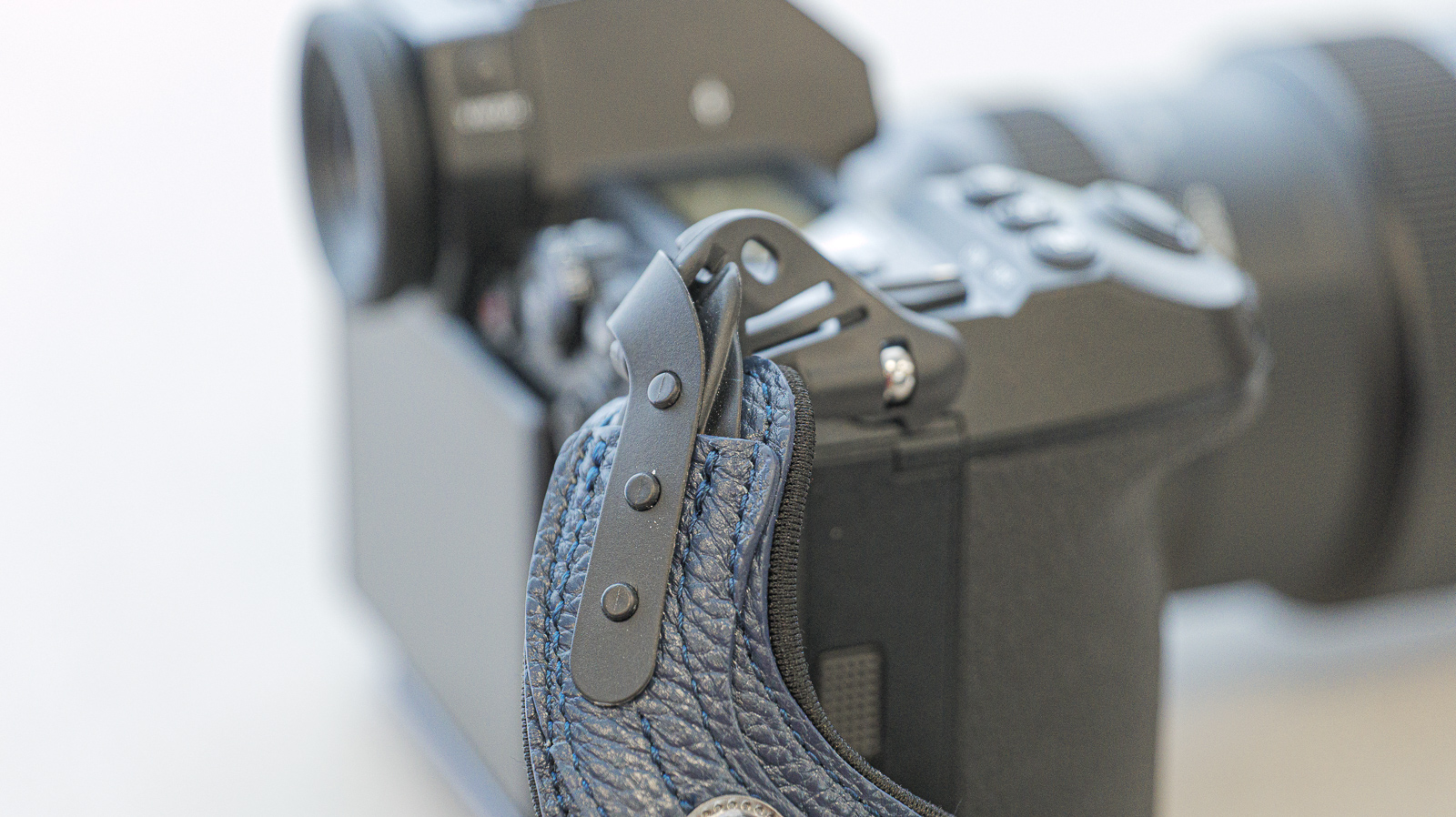 This hand strap has a core of flexible polymer that connects from the camera’s tripod mount to the neck strap connection point on the right. It’s then wrapped in colored leather and lined with memory foam cloaked in soft velour.