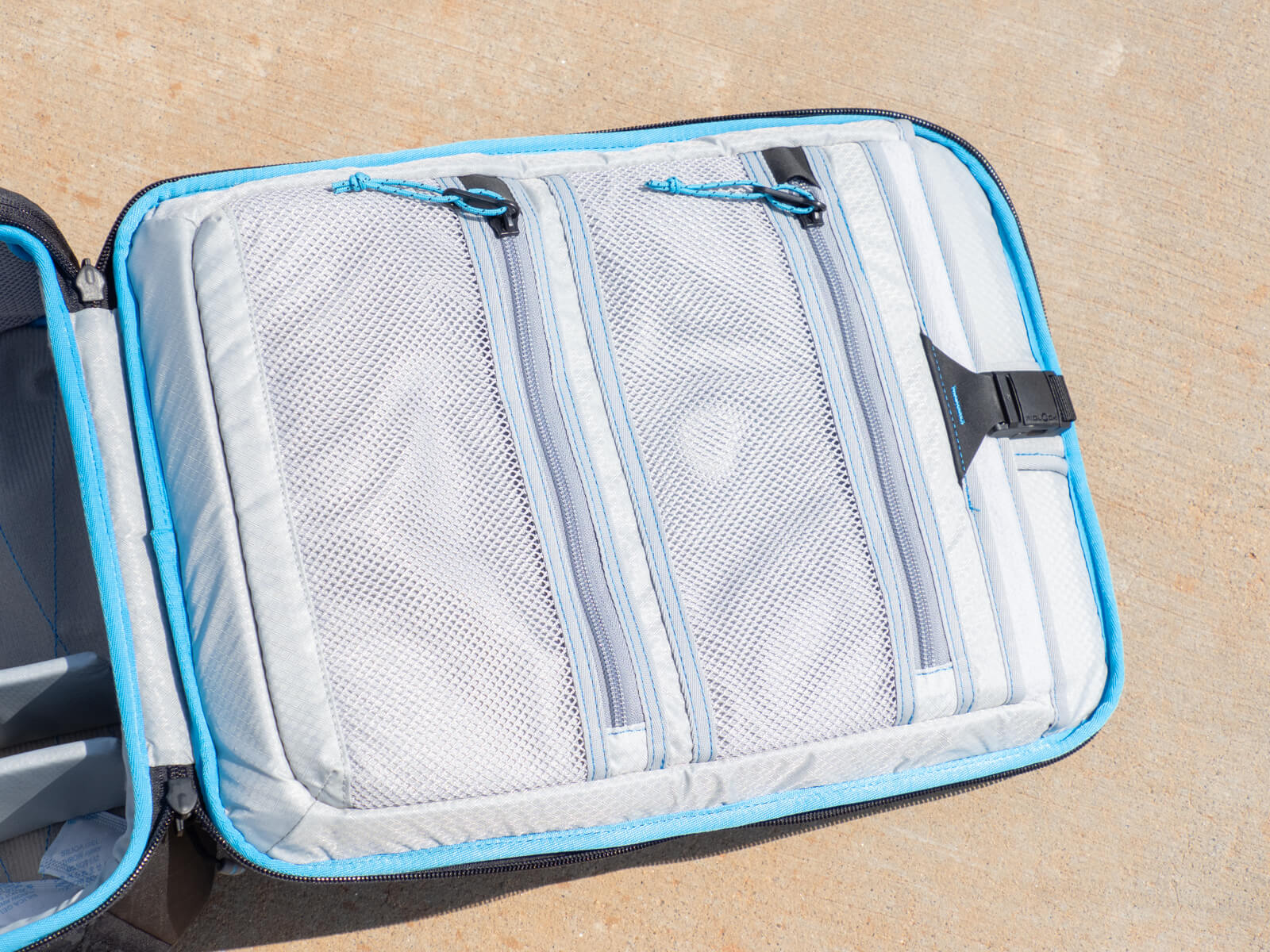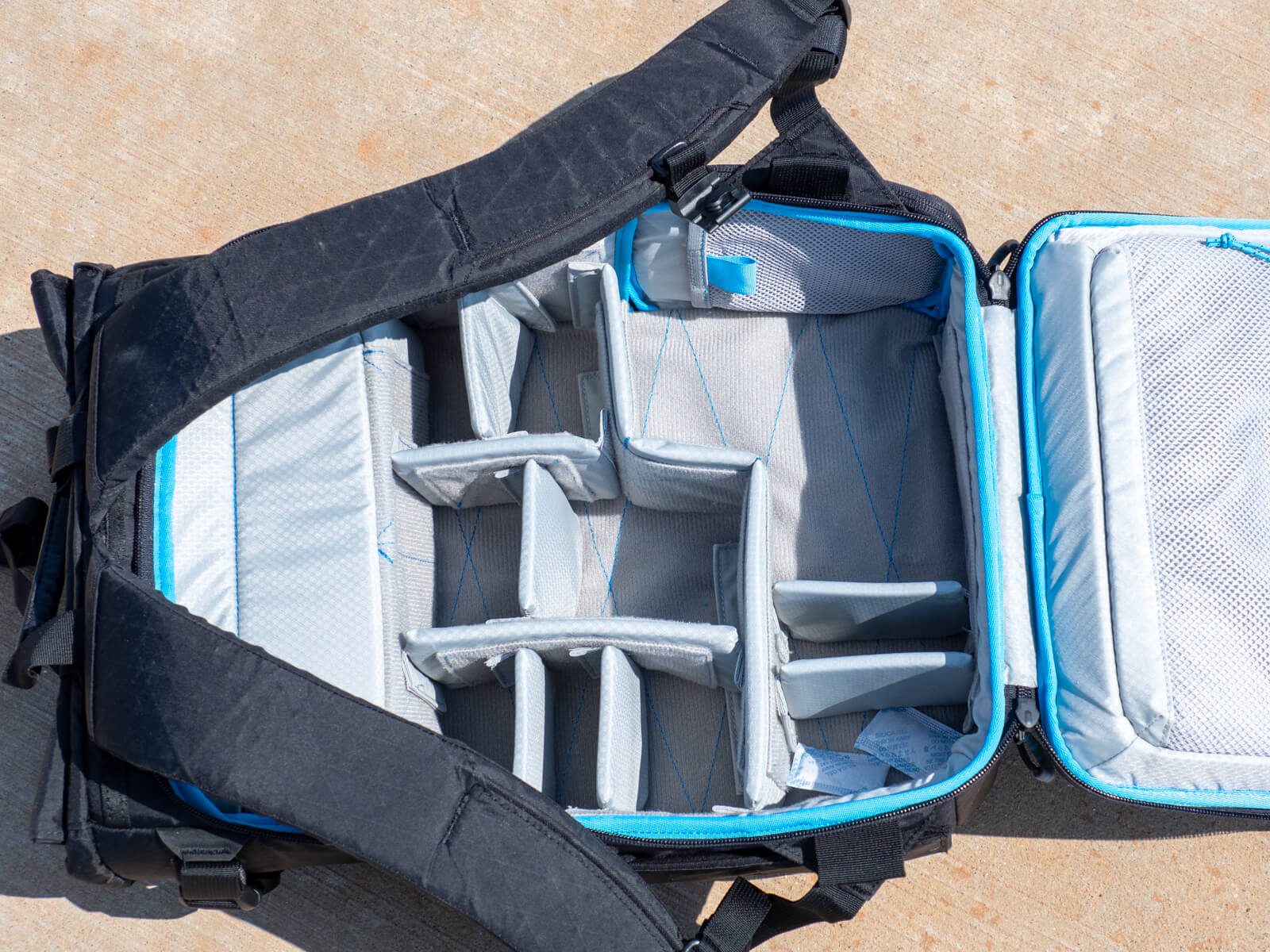 The back of the bag is where you’ll find the main gear compartment. Before you get into the back of the bag, you’ll be amazed by the amount of padding on the back of this bag. The padding is thick and creates airflow channels, which help keep you cool. You’ll also see a handle in the middle of the bag that can slide over most rolling luggage handles. Open the back panel, and you’re greeted by the main compartment filled with plenty of dividers.