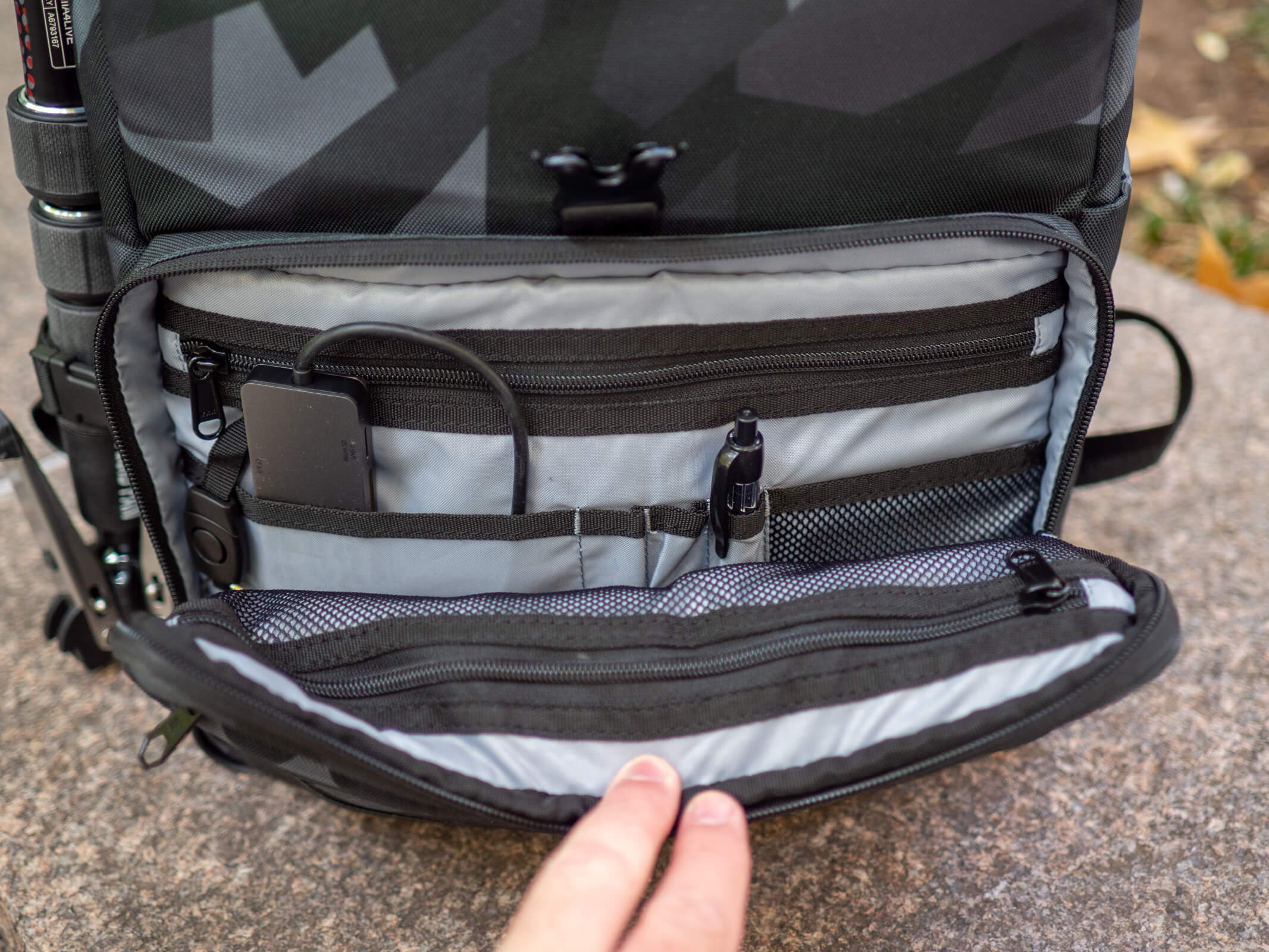 Another sleeve hides under the top flap. This sleeve can house a 15-inch MacBook Pro or a large tablet. My 12.9-inch iPad Pro probably had the nicest trip of its life thanks to the soft fleece lining. There’s also a small compartment for a wallet or picture ID. The bag can carry a water bottle and a tripod. A complaint here is that there are only straps and no pocket to rest the tripod in. This worked OK, still, I’d prefer a pocket to slip the tripod into with the straps to secure it at the top.