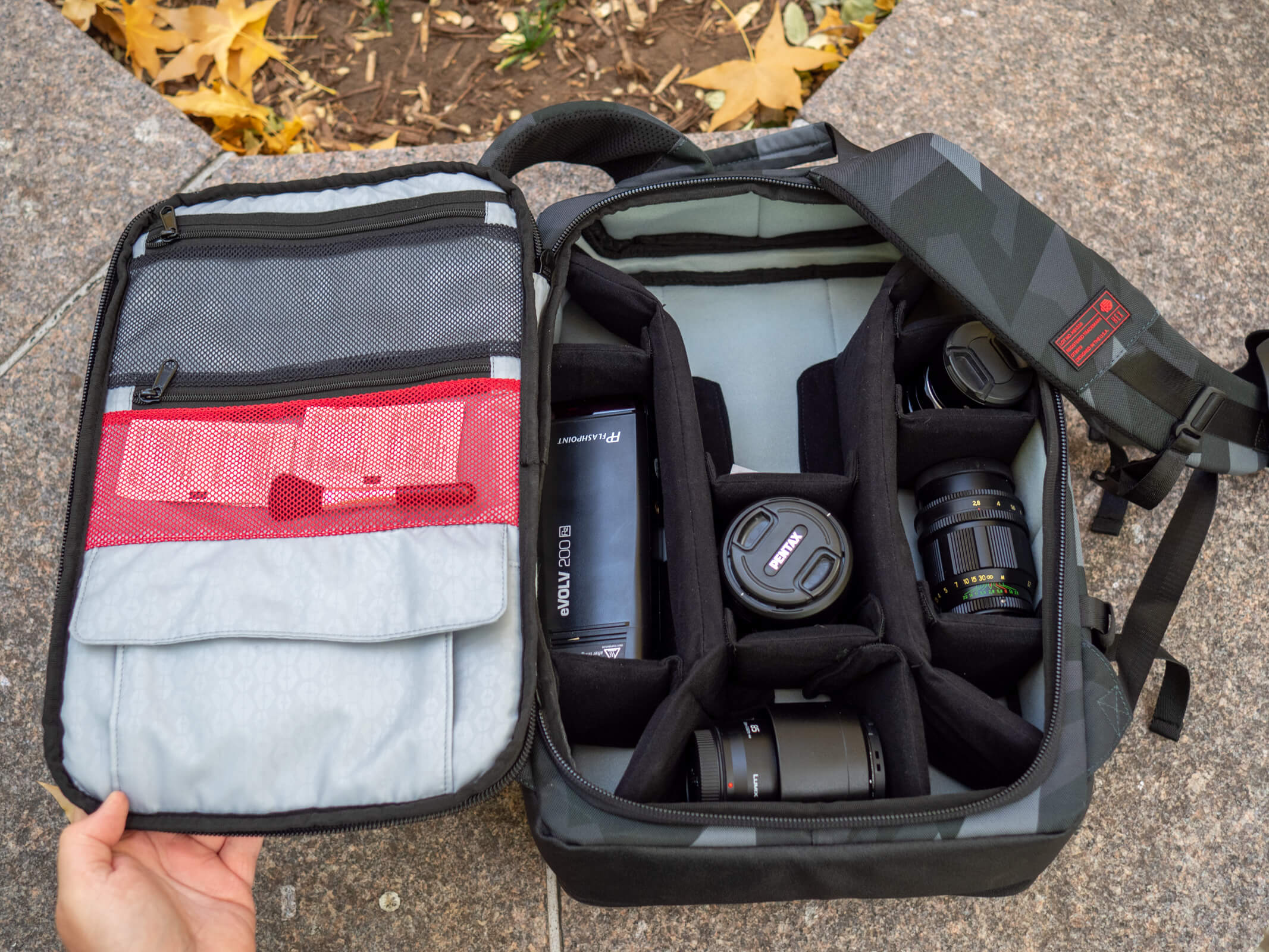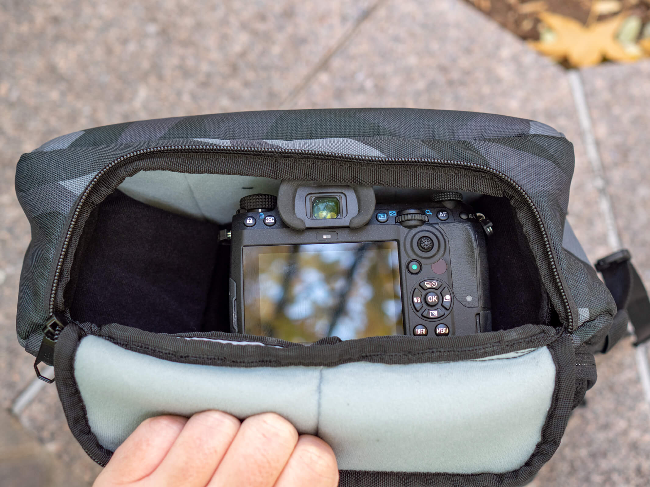 I loaded the bag with a Pentax K-3 III with the Pentax 16-50mm f/2.8 ED PLM AW attached. Then there were four medium prime and zoom lenses along with a Godox/Flashpoint AD200. You can easily adjust the thick dividers to accommodate the gear you own. You could carry several longer zooms, multiple smaller primes, more cameras, a drone and so on. It’s a versatile system.