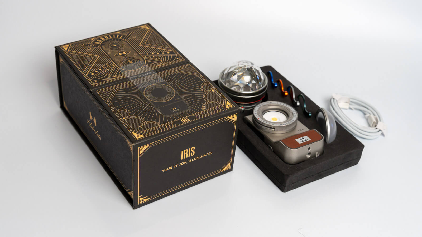 It comes wih power cable (USB C-type), dome diffuser, gel filters, Fresnel lens, Aperture ring, adjustable lens, a cool funky Magic lens and Quick Start guide.