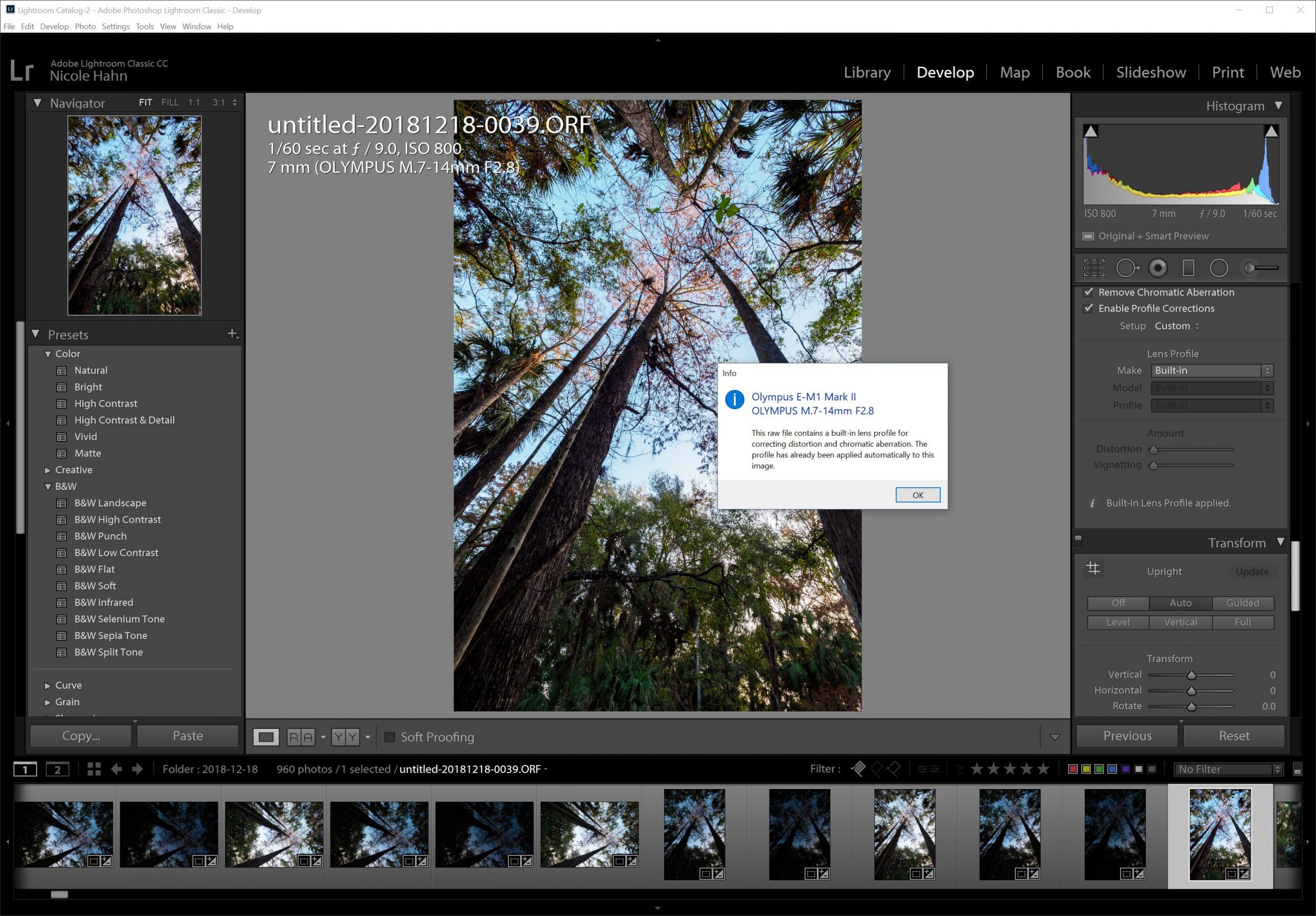One thing that threw me at first in post-processing via Lightroom was the “built-in” profiles Olympus embeds in its RAW files. I was used to working with the drop-down menu that matched the body to the lens. Every Olympus RAW file (ORF extension files) includes a built-in lens profile that is automatically applied in Lightroom to your images for lens corrections.
