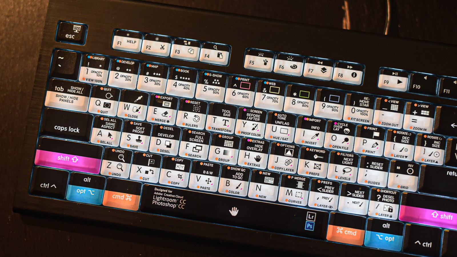 It’s perfect for those of us who subscribe to the Adobe Photographer bundle with Lightroom and Photoshop. In addition to the standard letters and controls on the keys, there are also colored and graphical indicators that teach you what each key does.