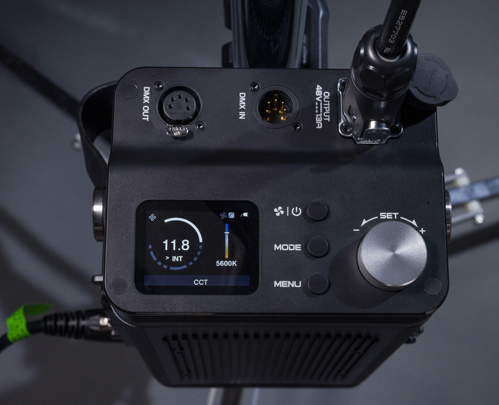 The Neewer AS600B’s controls are all on the power supply. A single cable connects them to the light. The screen shows the settings for the current mode. Power, mode and menu buttons are in the middle. The large controller/set knob it to the left. Above these are the DMX sockets — in and out and the connector to the light.
