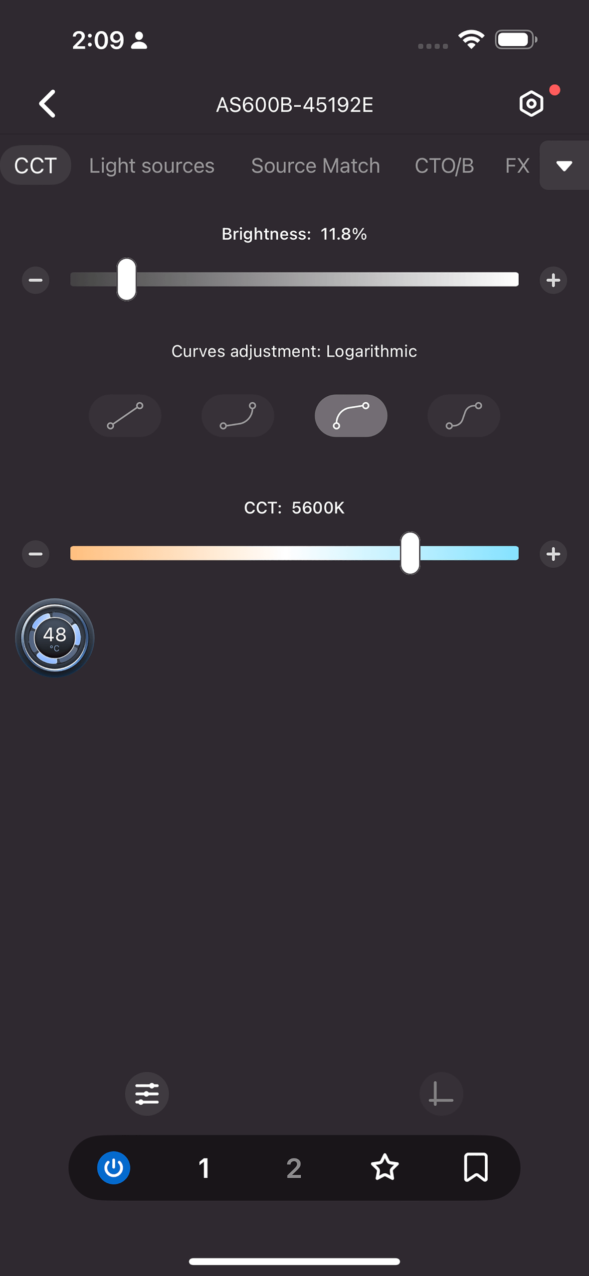 The Neewer AS600B can be set using an app with DMX and 2.4 G wireless controllers. The screenshot below mirrors the settings on the light’s controls. Notice the temperature reading just below the CCT slider. It says the light is running at 48ºC/114.8ºF. The blue lines around it show that the very quiet fan is running at slow speed. Short pressing the power button on the power supply/controller changes the fan settings.