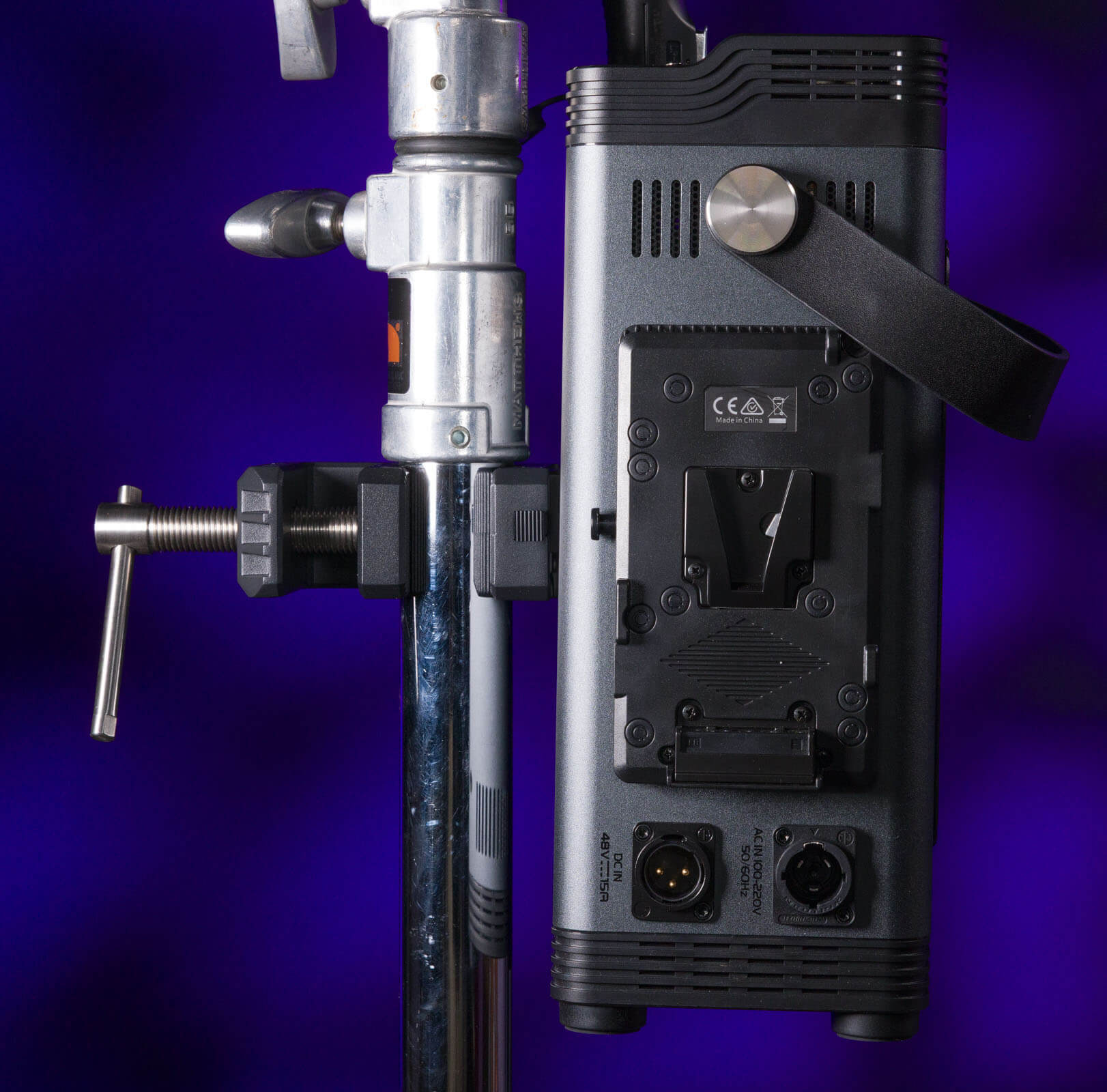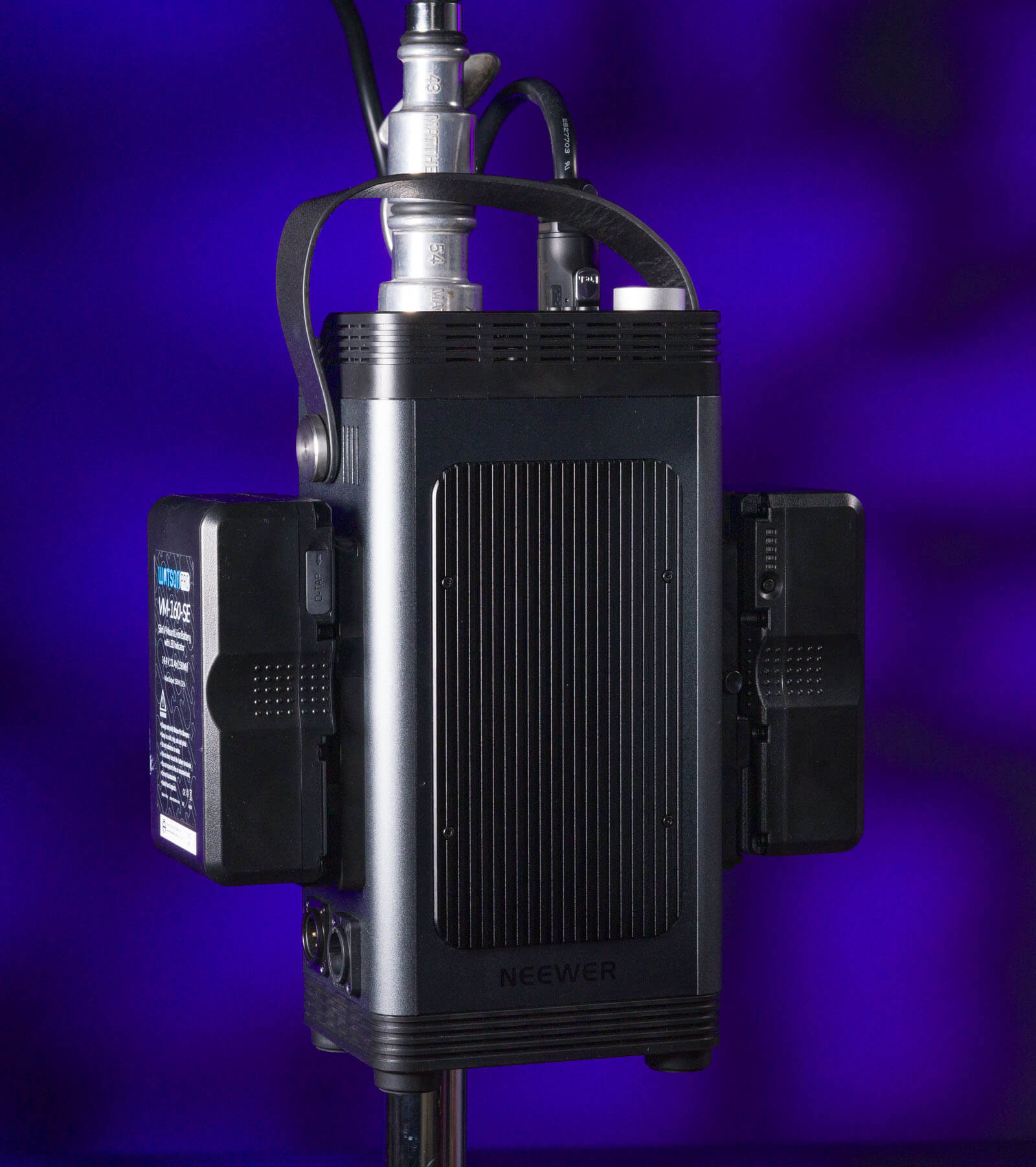The power supply/controller mounts to almost any heavy-duty light stand’s main column with what Neewer calls its super clamp. I wish this clamp were available separately for other V-mount needs. Sadly, I can’t find it listed anywhere on Neewer’s website. I love this super solid method of mounting a heavy unit to a stand.
