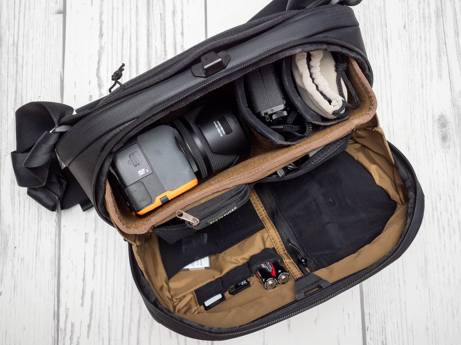 Given the bag’s dimensions, the main camera compartment is bigger than you might think. There’s plenty of padding inside to protect your gear, and there are two padded dividers that you can move around to fit your camera and lenses. Like the outside, the bag’s interior has an excellent clean design, and the choices for storage are smart.