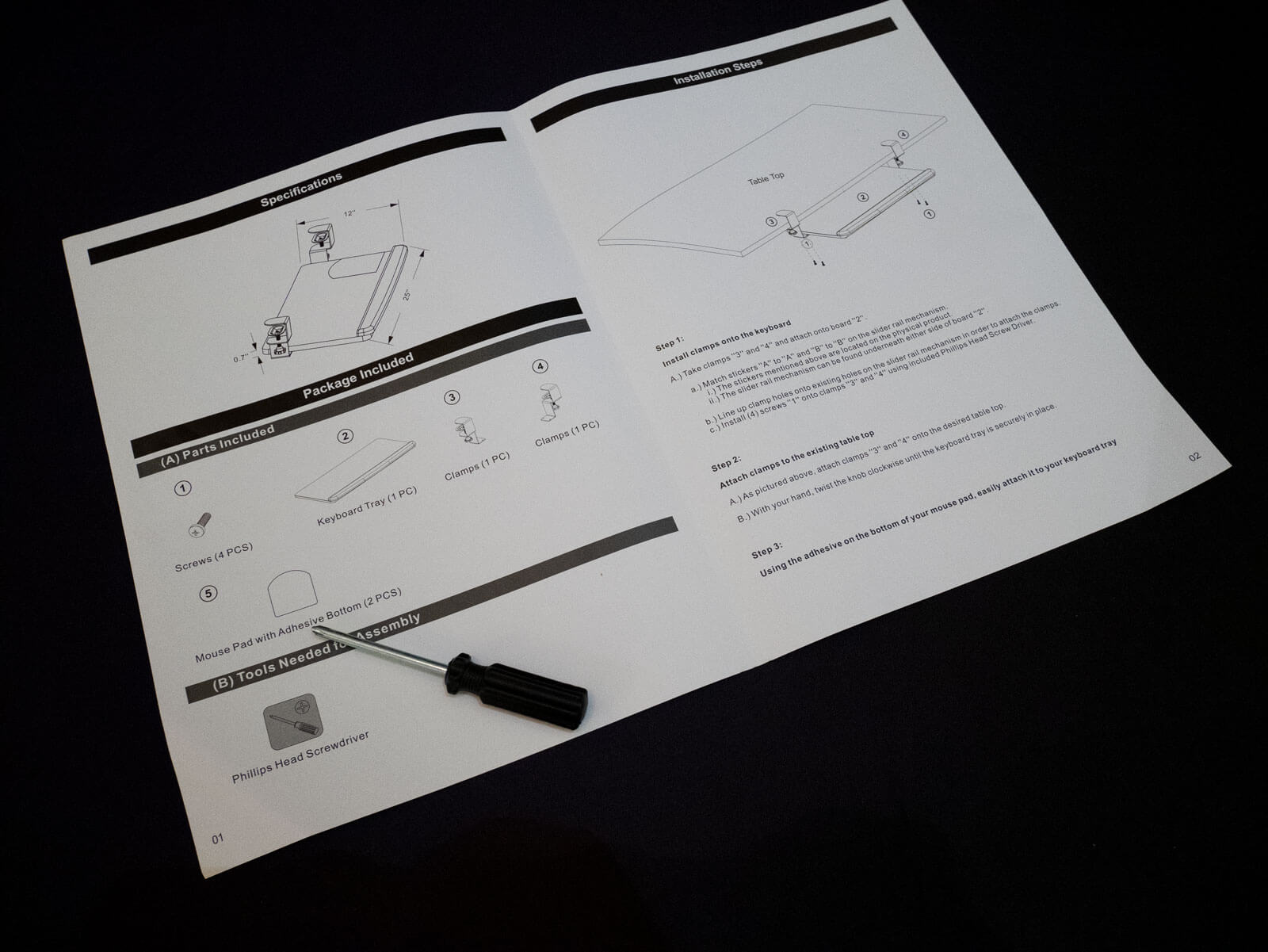 You need to attach the clamps to the base. Instructions were clear and easy to understand. The instructions suggest you need to have a Phillips Head screwdriver for assembly. But no worries there it was included with the screws! The clamps needed to be separated to create a sleek shipping size box. Once the unit was assembled it felt solid.
