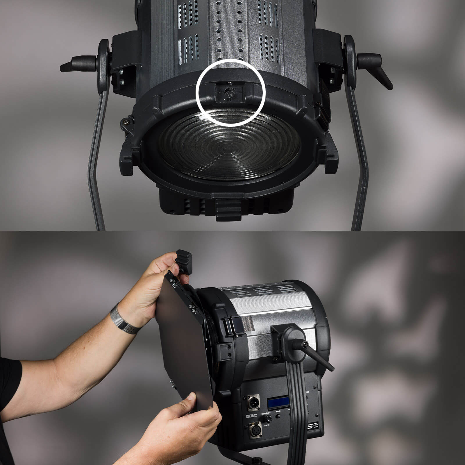 Traditional fresnels have a spring-loaded catch at the top front that rotates out of the way so barndoors can slide into the provided slot. The LF-RGB-65 has a similar catch. Unfortunately, on the light I received it must be removed completely before the barndoors can be fitted. A Phillips-style screwdriver fits the clip’s screw. The barndoors themselves can only be closed in one direction because the smaller side doors are the wrong shape.