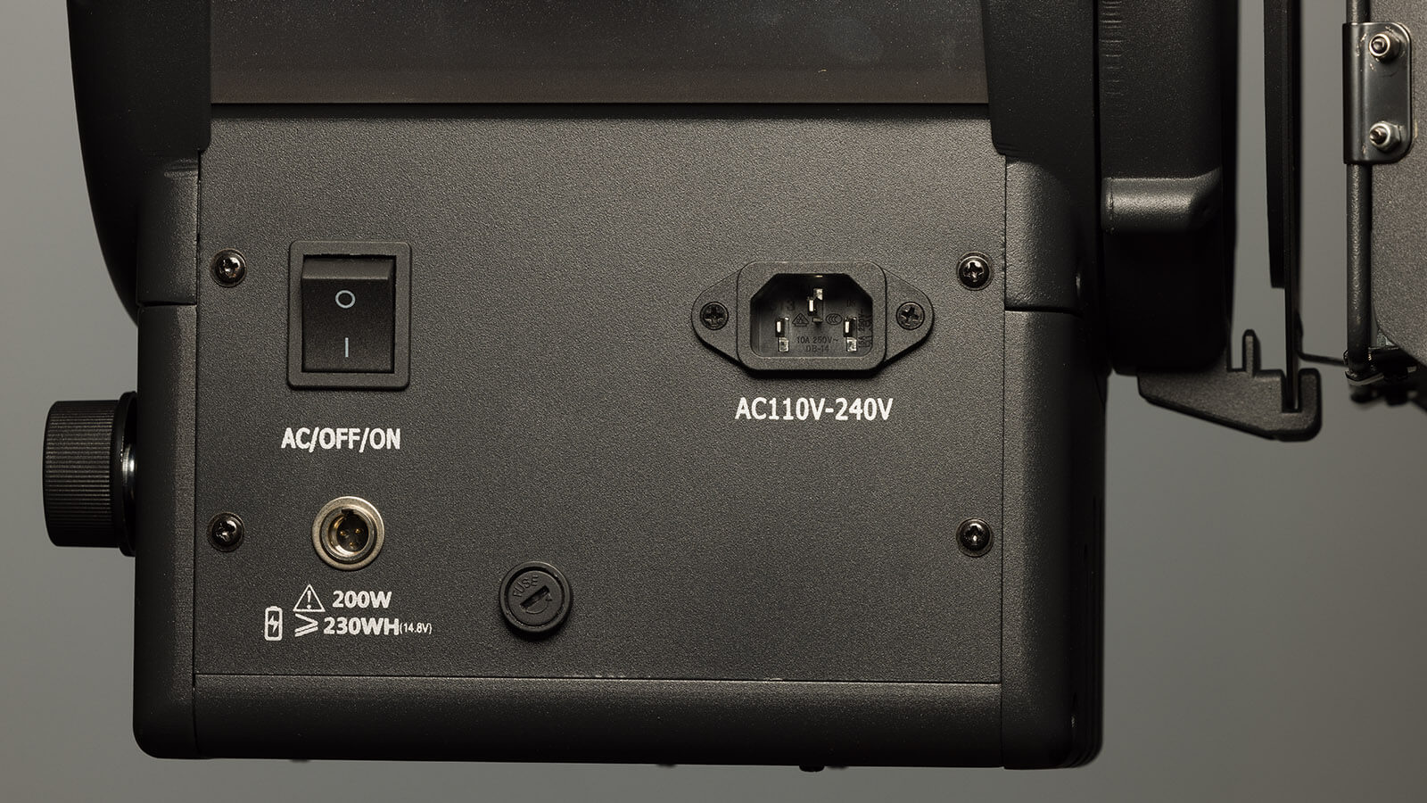 There is a semi-mystery three-pin socket on the power side of the Generay LF-RGB-65. Under it is a battery symbol, the greater than or equal to glyph and the words 230WH-14.8v. There is no mention of this plug in the instruction manual, nor is there an accessory connector shown on the product’s website. It looks like this fresnel can be battery-powered. Is this a future accessory Generay anticipates?