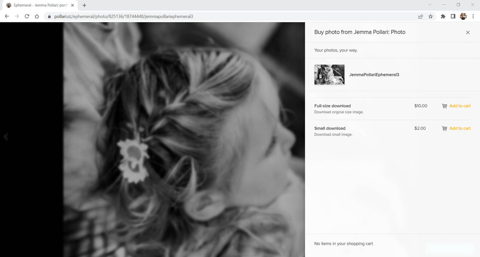 Once there is a photo in your cart, a button appears at the bottom of each page which opens the cart. Visitors can proceed to checkout from the cart.