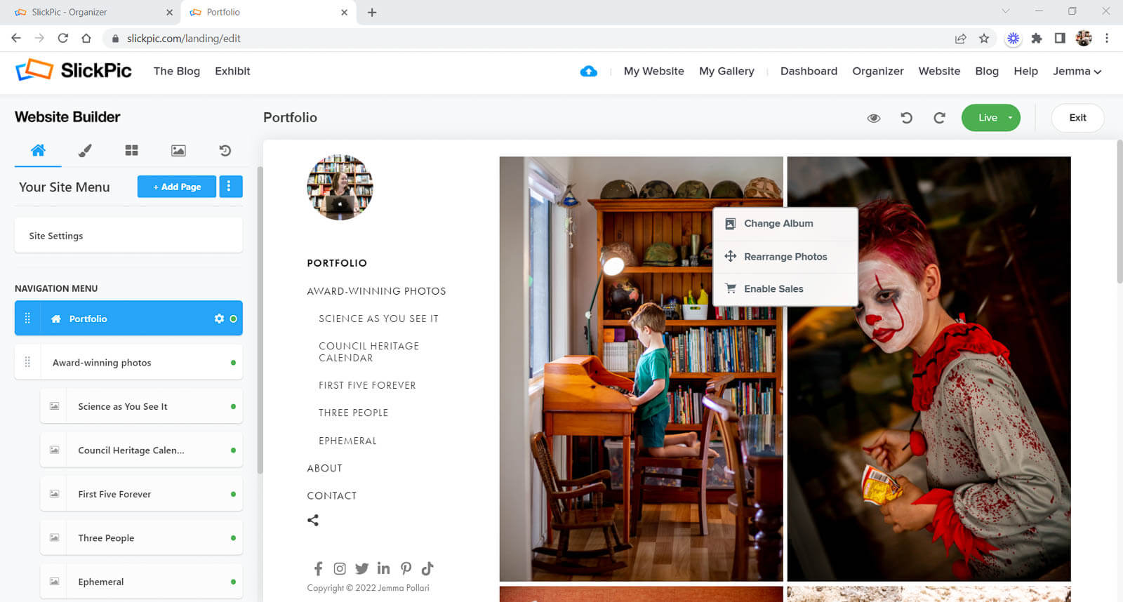 For those with the time for a more DIY approach, you can also build your own Portfolio Website using the Website Builder. It is completely integrated with the Organizer, so all the work you have done to create beautiful, organized Albums for your Gallery carries over to your new site.