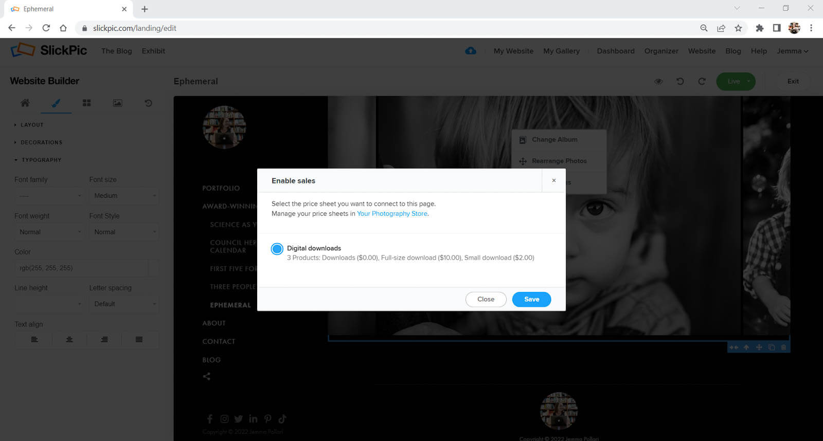 After setting up your Price Sheets and Products, you need to enable sales in Website Builder. Each Album on a page can have a Price Sheet attached to it, and Price Sheets are reusable across pages and across different SlickPic Websites in your account.