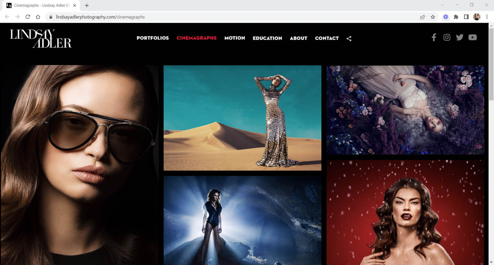 Cinemagraphs are a unique feature of SlickPic’s Portfolio Websites which have great potential for photographers and visual artists. In Photo Grid options you can turn on autoplay videos and loop cnemagraphs to bring some movement to your page. Iconic photographer Lindsay Adler has an excellent example of this in her featured SlickPic portfolio.