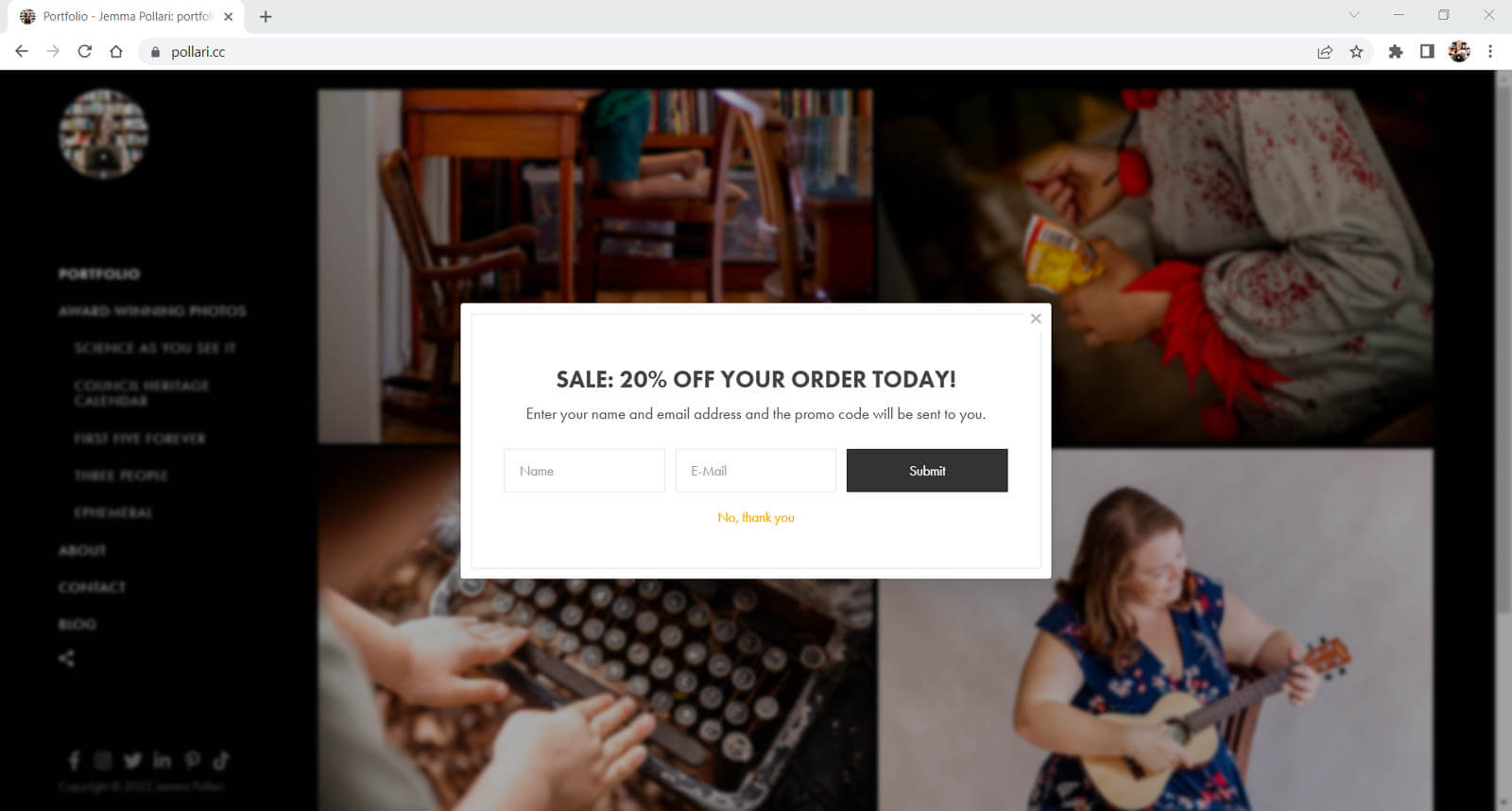 Secondly, you can add it to the Marketing Pop-up. Browse to Website > Manage > Marketing and you will find the settings to enable the Marketing Pop-up. This is a powerful tool, and you can share information about sales as well as collect emails.