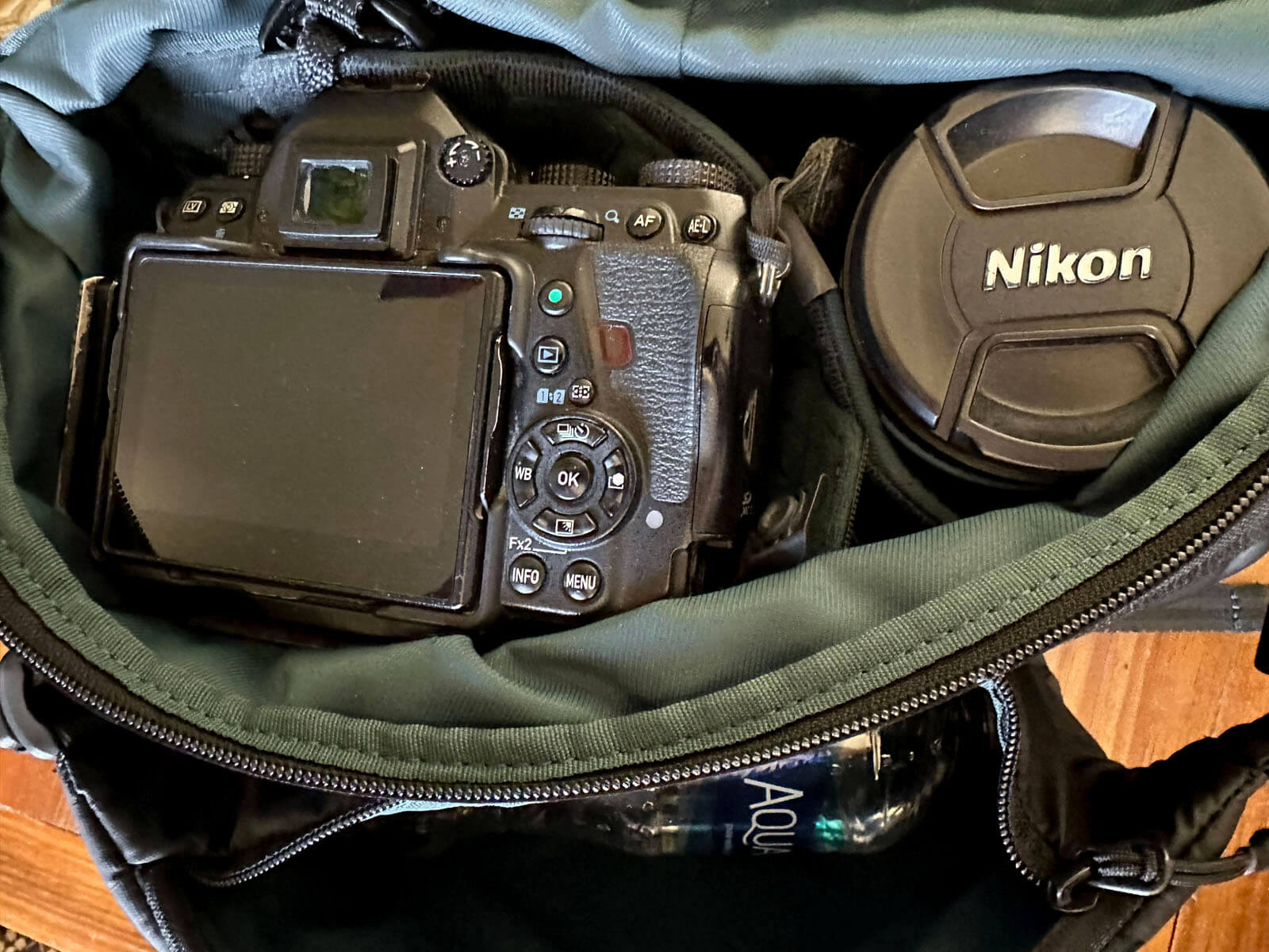 To be more specific, I was easily able to fit a Pentax K-1 full-frame DSLR, which is a large, heavy camera with an attached 28-105mm f/3.5-5.6 zoom lens and a Nikon 28-300mm f/3.5-5.6 zoom lens, which is a relatively large lens. I could have easily fit two smaller prime lenses instead of the zoom lens. Or four or five Lensbaby lenses! This was comfortable in the field and worked well.