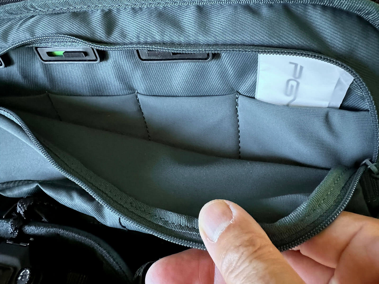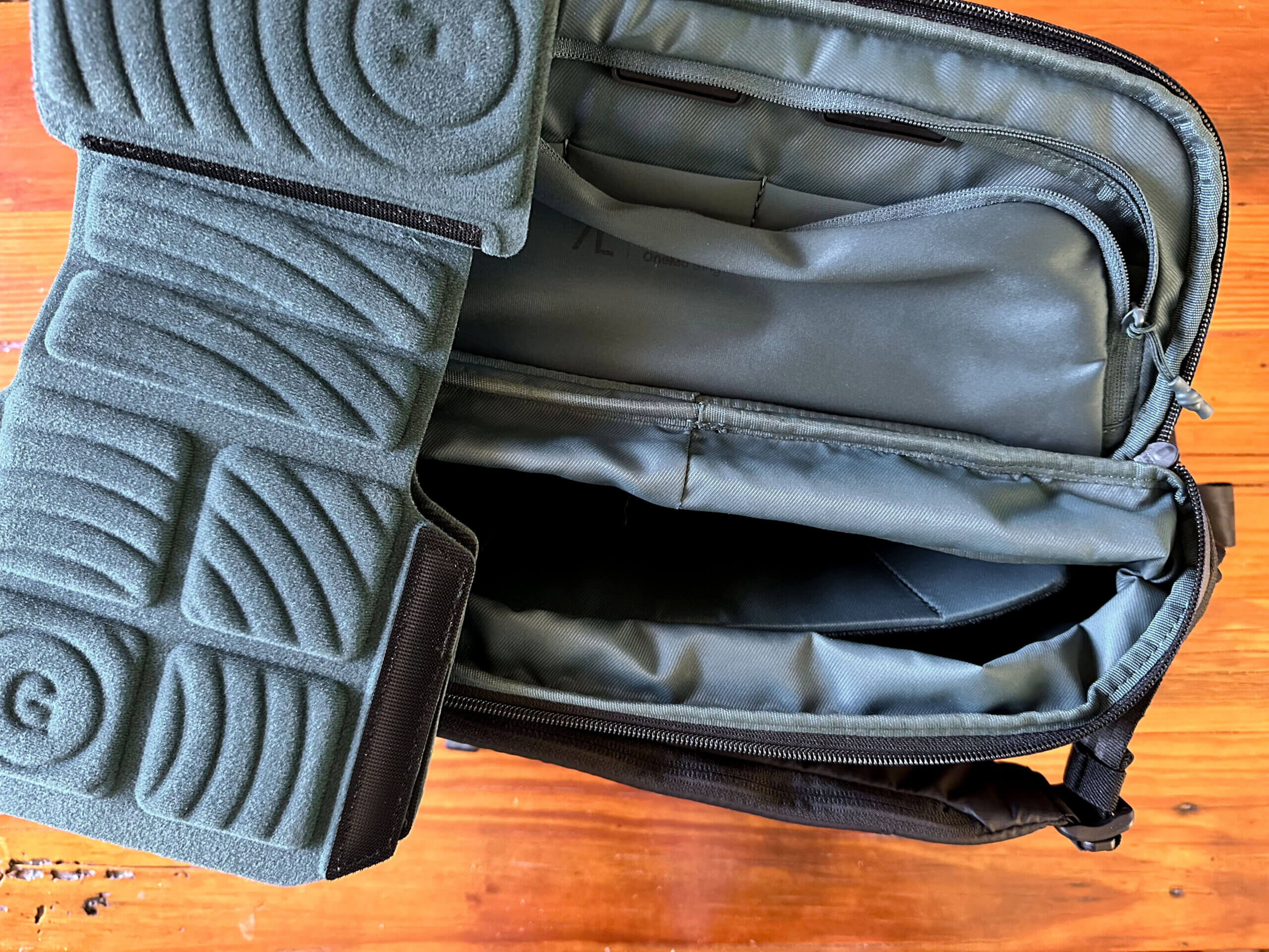 The OneMo Sling 7L is a sleek modern bag, modern enough that it actually has a tiny hidden pocket for an AirTag (it’s at the bottom of the main compartment near the tag). This bag has a good number of zippers and pockets. However, it never feels overengineered or confusing. It’s not one of those bags where there are so many compartments that you can’t remember where you put your memory cards.