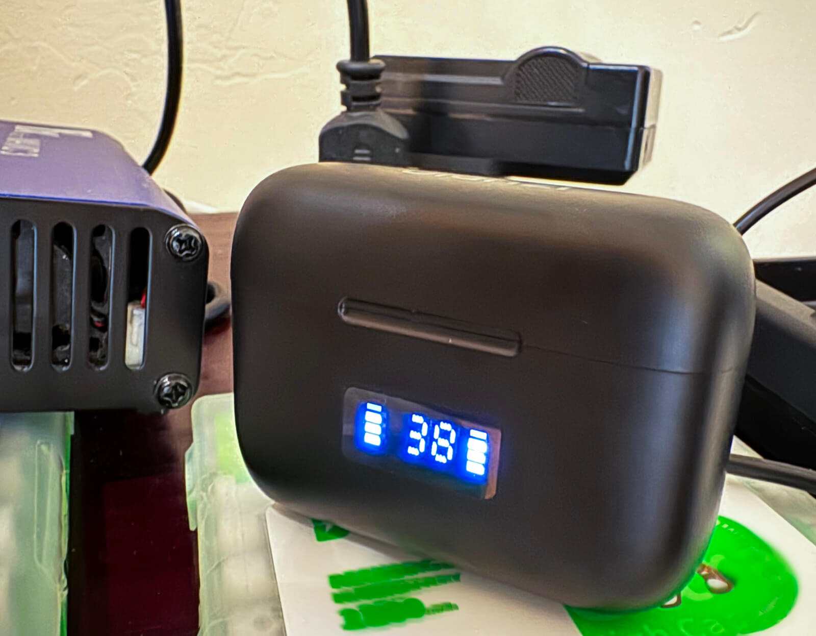 - Battery 3.7V (can fully charge both transmitters one and a half times)