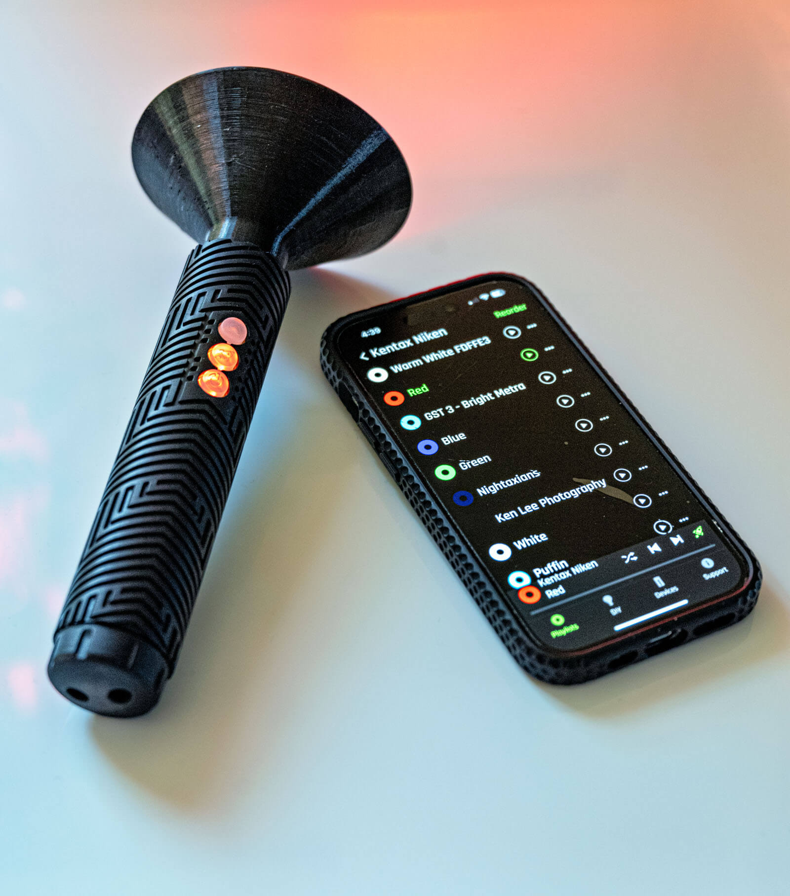 - When you change colors or brightness, you must take care to not be in the frame of the photo or at least completely block the phone light from shining in the lens or you will get streaks. Thankfully, the app has a black background, which is far better than a bright background. While it’s conceivable that you could do this with the back screen of the ProtoMachines if you keep it turned on, it’s much smaller and dimmer. But a huge difference here is that there are physical buttons, so if you have your presets memorized, you don’t need to activate the lights on the screen.