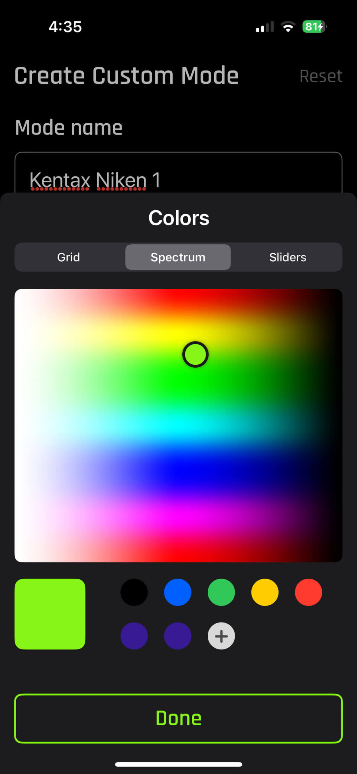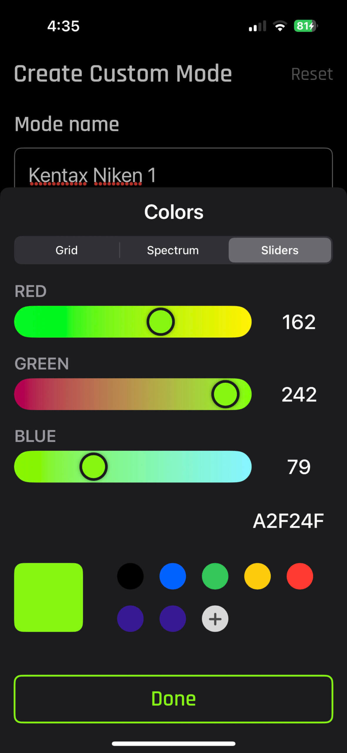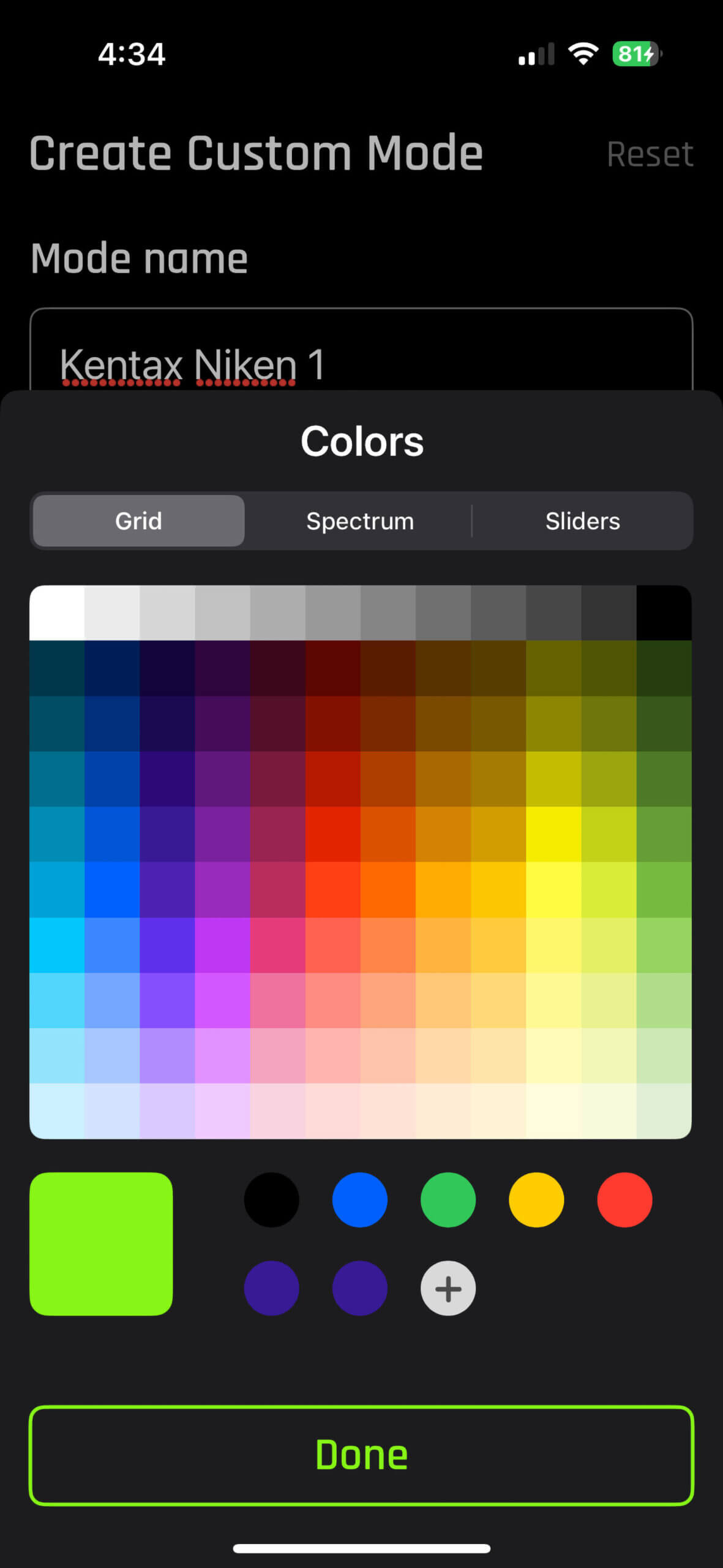 Furthermore, there are three ways that you can save colors: Grid, Spectrum, and Sliders. Let’s have a look at these three ways, all from the perspective of light painting subjects (in other words, I will cover solid colors only, and not go over fades, strobes, and other functions that are not as helpful for light painting).