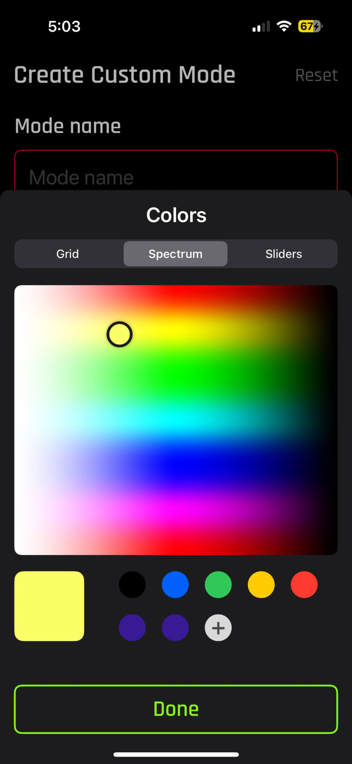 Exactly what you think. Select from a nearly infinite amount of colors that are displayed as a spectrum. This is probably the quickest way to select very specific custom colors since you can see all the colors laid out before you. Many other RGB light apps use a spectrum to select colors on lights such as RGB panels.