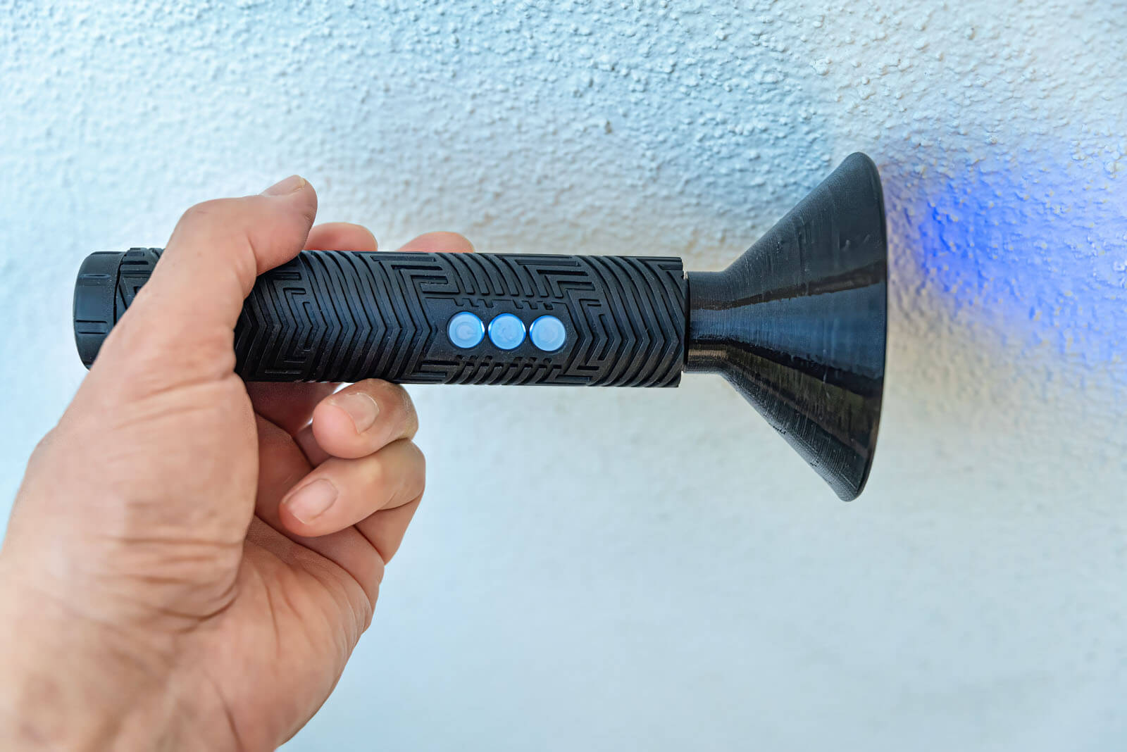 Above: The left photo is the RGB Critter, using a warm white color. The right photo is a custom setting I have (RGB of 45 at 53% saturation at 7.5 brightness). I attempted to visually set the brightness of the ProtoMachines so that it appeared to be the same as the RGB Critter when I was aiming at both a wall and the ground. I illuminated the scene at the same angles for the same amount of time in both photos, largely to show the width of the beam. Take note that my custom warm white setting is warmer in part because I mistakenly left the saturation at 53% when I meant to lower it back down to 40% after my last photoshoot, just for the record.