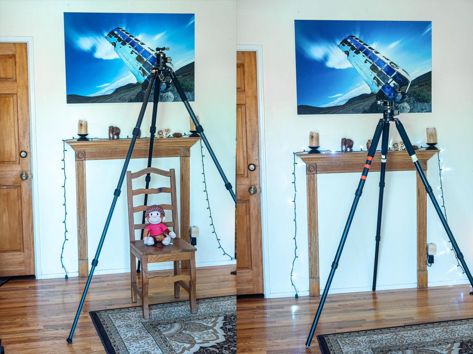 I have a stable, heavyweight tripod already. I’ll occasionally compare the Robus to the Feisol CT-3372 tripod that I have used since 2013. The Feisol has a maximum load of 66 pounds and weighs 3.8 pounds. Its maximum height is 58.3 inches.