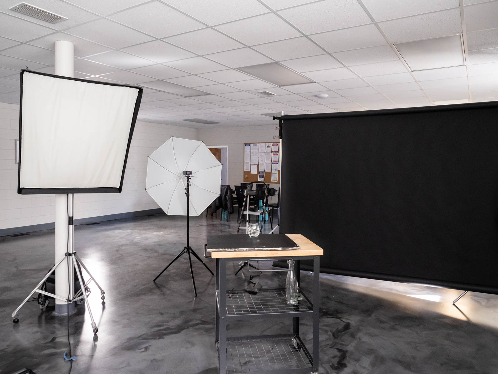 We started out with a black background and small bar cart, that would serve as our table. We put a piece of slate on this in order to get a darker look. From there, we brought in an umbrella lit by a Godox AD200, which would create a key light. We also had a large softbox to the left which would serve as a rim light.