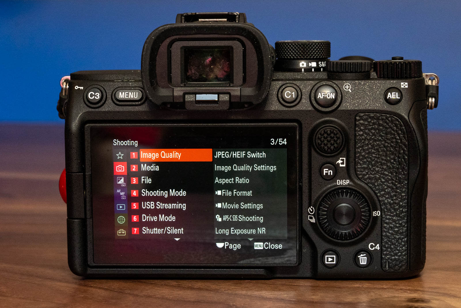 On the back, the joystick has been improved and is easier to use, and the AF-ON button is no longer jammed up next to the viewfinder. It’s large, and is at the perfect placement for back-button focusing. The rest of the back remains similar to the a7 III, with a C1 and C3 buttons, a Menu button and AEL button up top. Next to the LCD screen you’ll find a navigational wheel (which I have set to adjust ISO), Fn button, the joystick, playback button and delete button. While this isn’t a vast difference over the a7 III, the placement makes way more sense, and the buttons have a nicer feel to them.